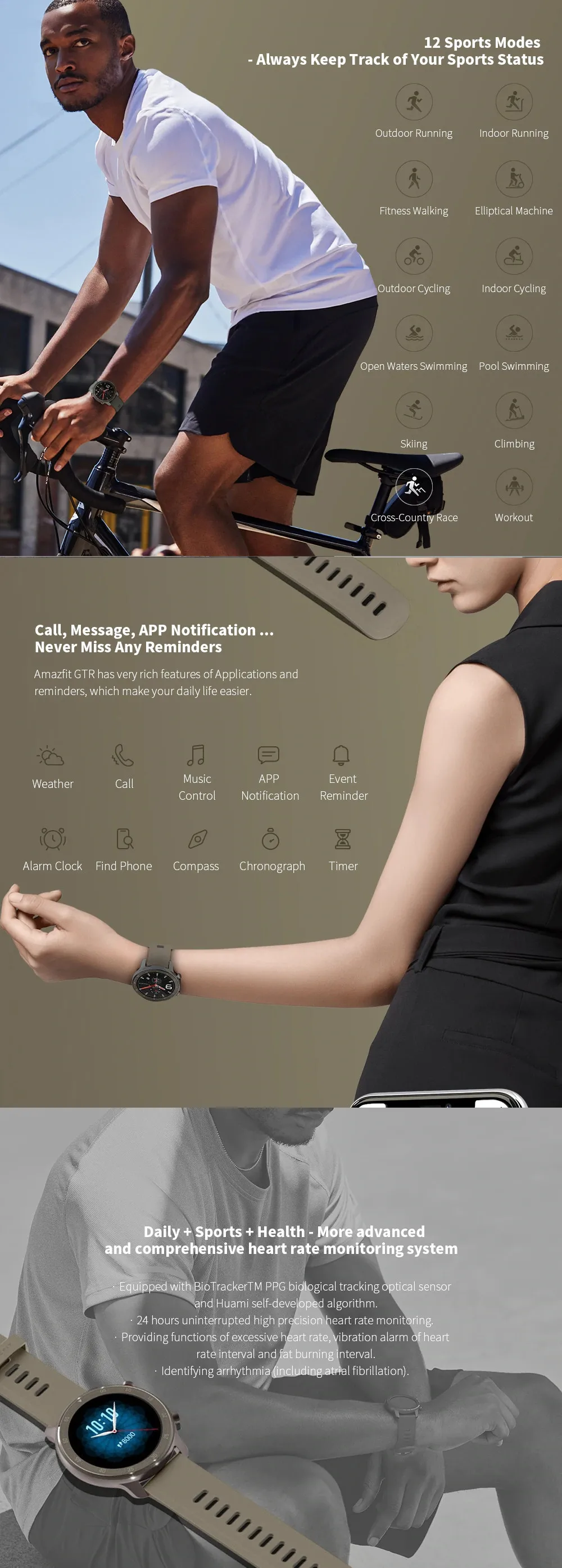 The Amazfit GTR, integrated with the BioTrackerTM PPG biological tracking optical sensor and an algorithm developed by Huami, offers advanced full-scale heart-rate monitoring. It not only provides a 24-hour ceaseless high-precision heart-rate monitoring, but also provides functions such as vibration alerts on heart rate much too high or out of heart rate range while exercising, and recording and viewing fat-burning range, making exercise more scientific and healthy