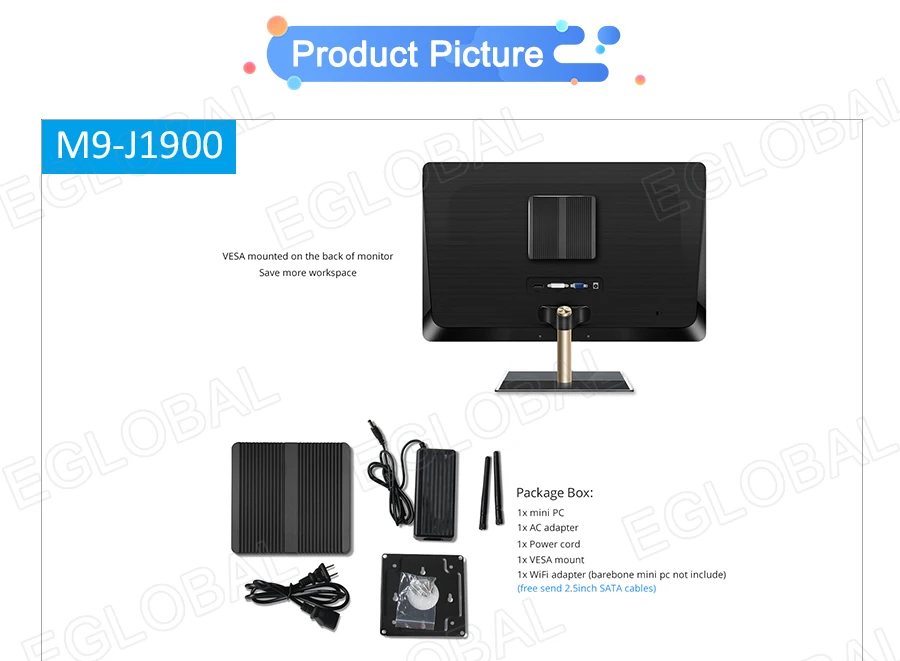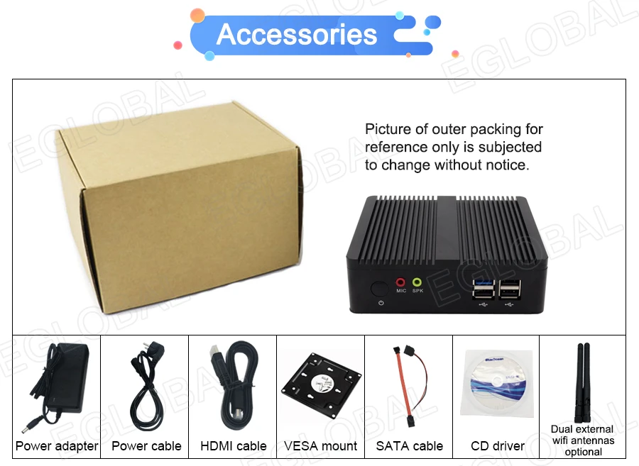 Standard | 1xMini PC, 1xPower Adapter, 1xPower Cord, 1xScrews Bag, 1xVESA mount | |