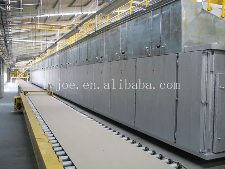 Under strict controls in temperature zones of dryer, the wet board dried by different temperature hot air blow.Modified starch would strick with the paper.Then dry gypsum boards would be transported out of dryer.