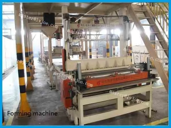 With continuous moving and vibrating, gypsum slurrywill gradually diffuse and evenlyscattered on the surface of moving bottom paper. Then it goes into forming machine and compound with top paper.