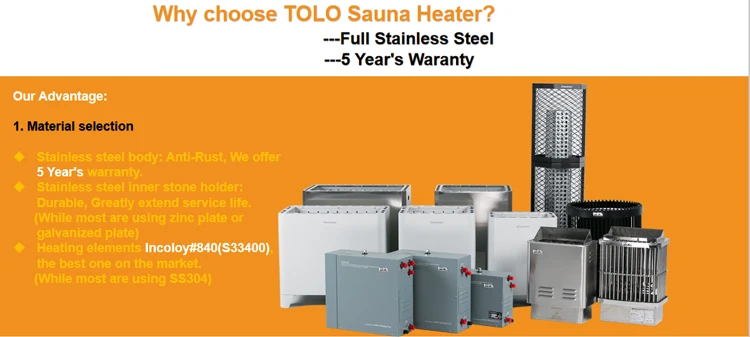 Model | Power (KW) | Voltage/Current(V/A) | Phase | Size of wire(N*mm2) | Sauna room(m3) | Stone volume(kg) |
