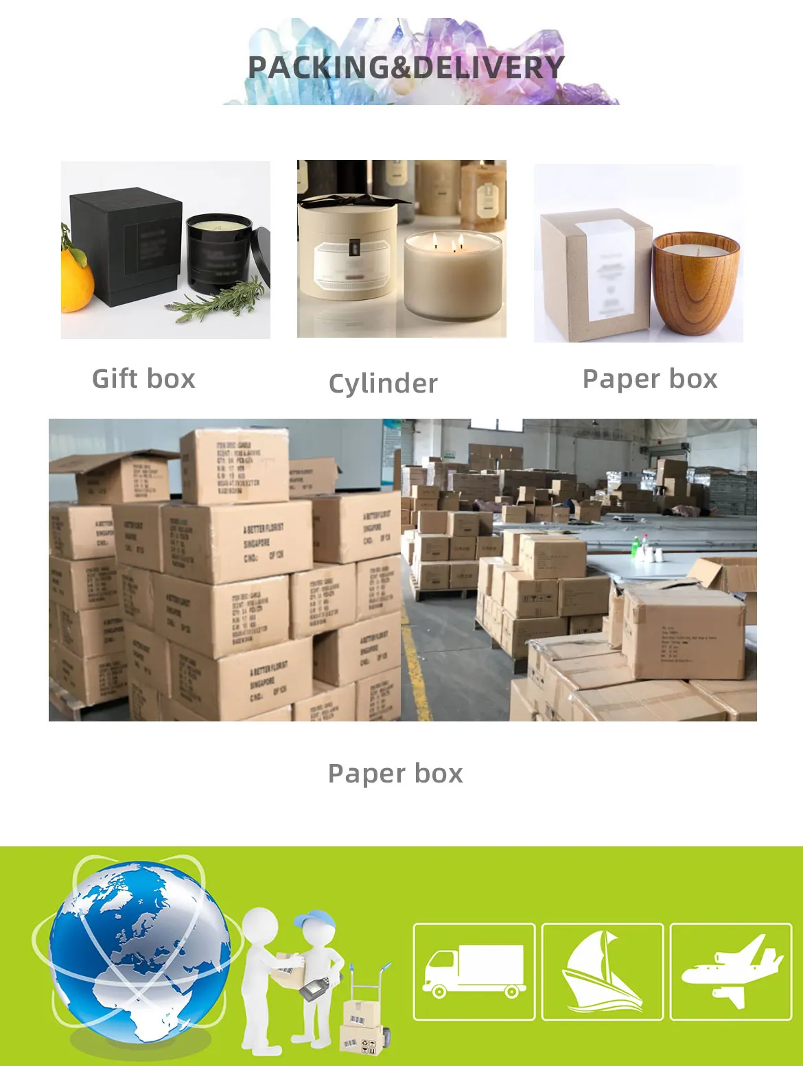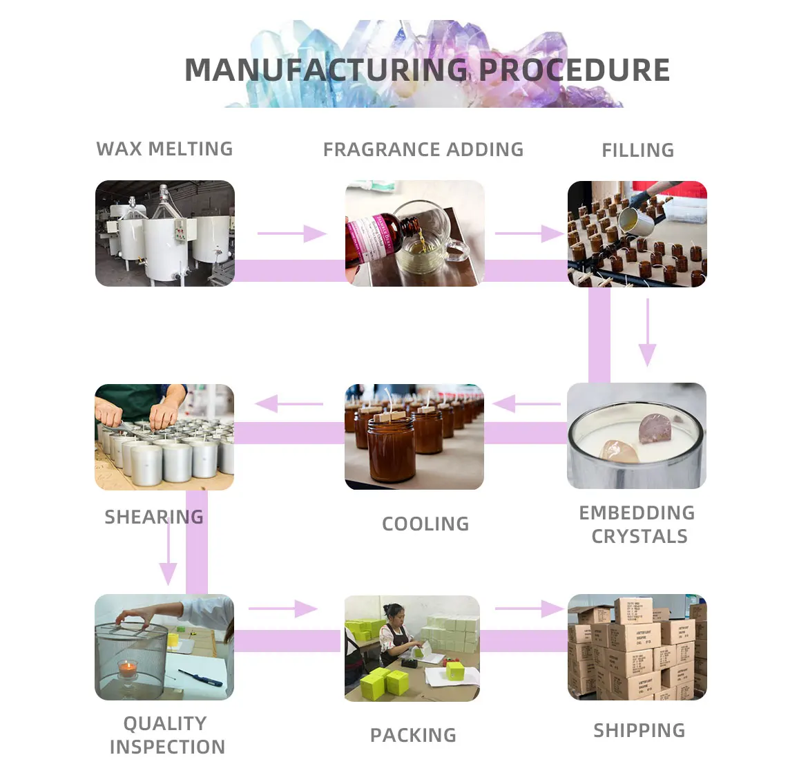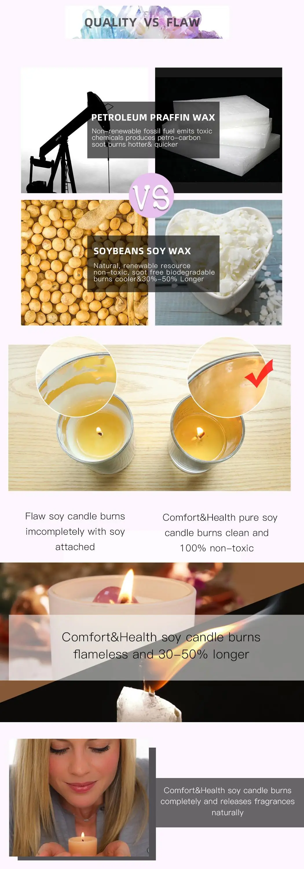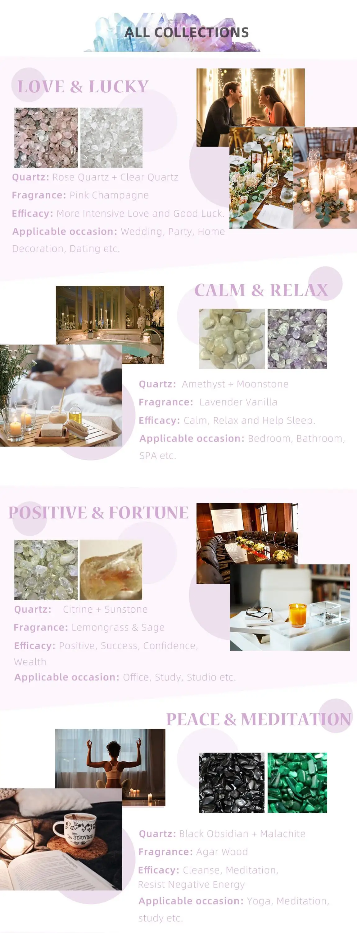 Material | natural crystal,soy wax,cotton wick/wood wick,plant fragrance,glass container |