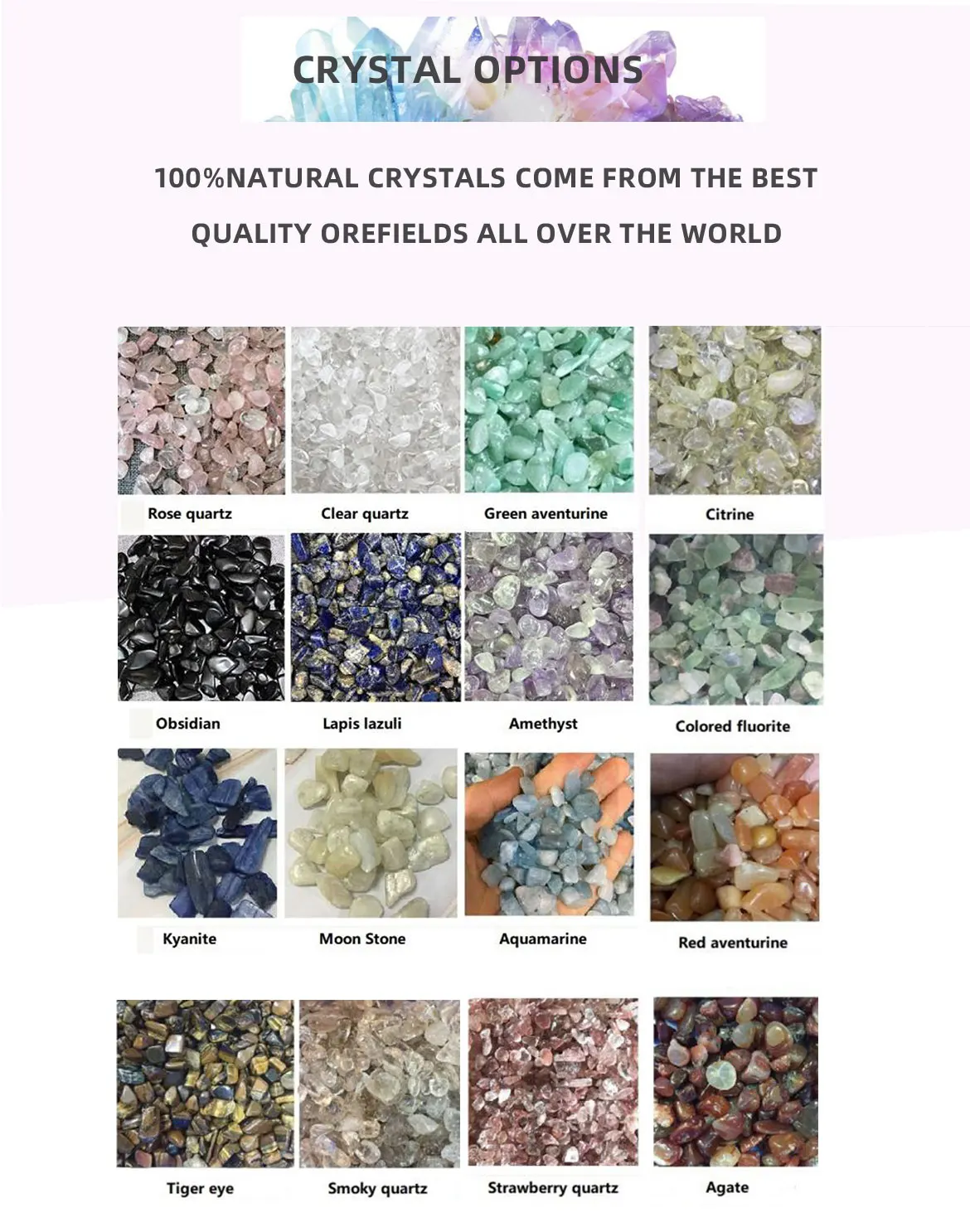 Crystals | rose quartz,clear quartz,amethyst,moonstone,citrine,etc |