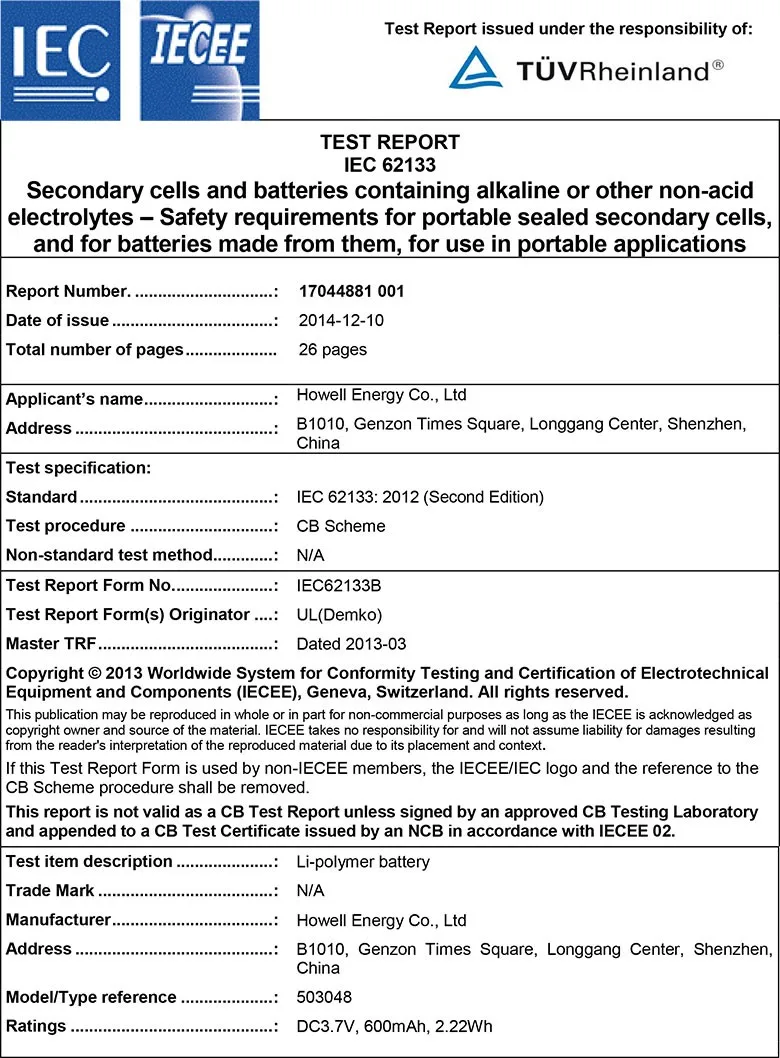 Global Certificate: CB/IEC62133/UN38.3/MSDS
