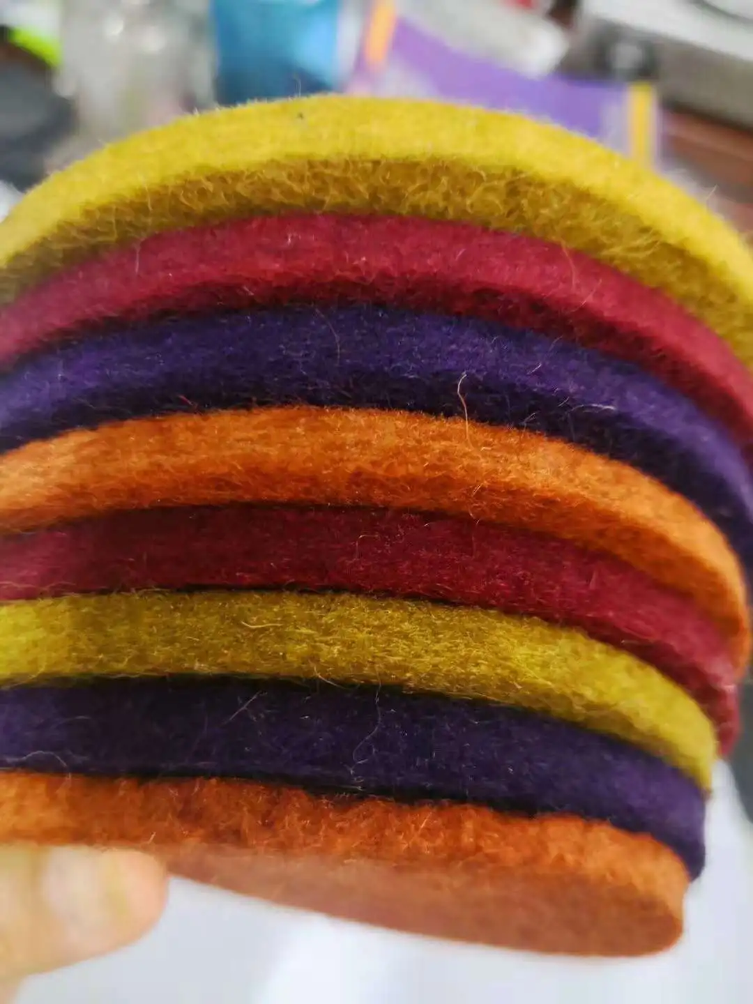 Felt is a popular name, also called non-woven fabric, material such as wool, polyester, viscose, polypropylene, acrylic, etc., felt has the characteristics of paper, that is, no matter how you cut it, the cut is not like other cloth, the fiber will spread out. Because of its characteristic, it's convenient to make felt product, and it looks a bit like woolen material. , it'll makes product more stylish.