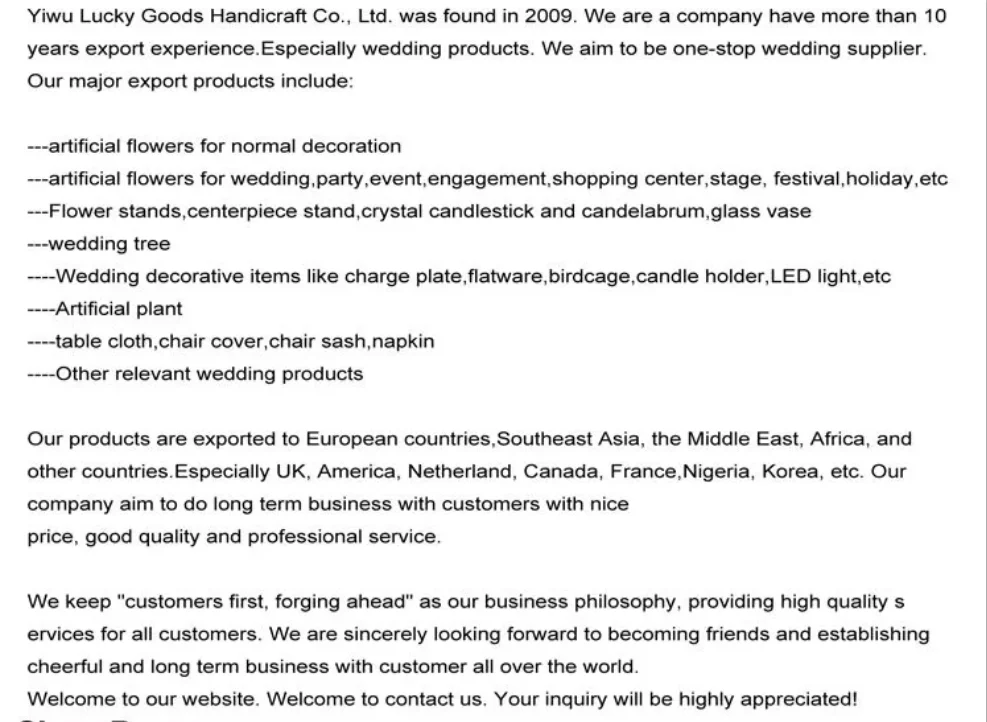 1\tOne-stop wedding supplier: you can find almost everything you needed for wedding in our website.Which will be convience and freight saving for you.