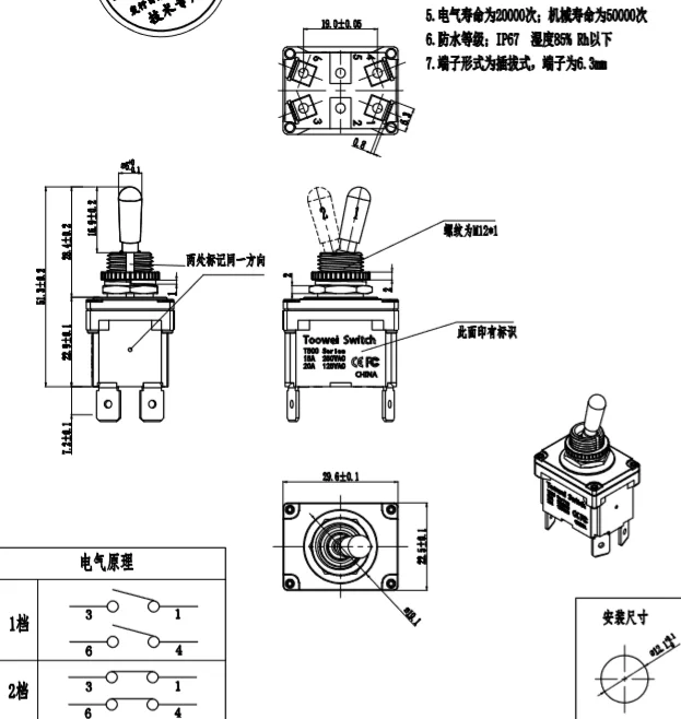 T500 series toggle switch is suitable for 50Hz/60Hz. This switch is used as the switching mode and reset mode in the circuit. The terminal block has screws, quick-connect terminals and soldering terminals. The waterproof level reaches IP67 with dustproof, waterproof and oil proof functions.