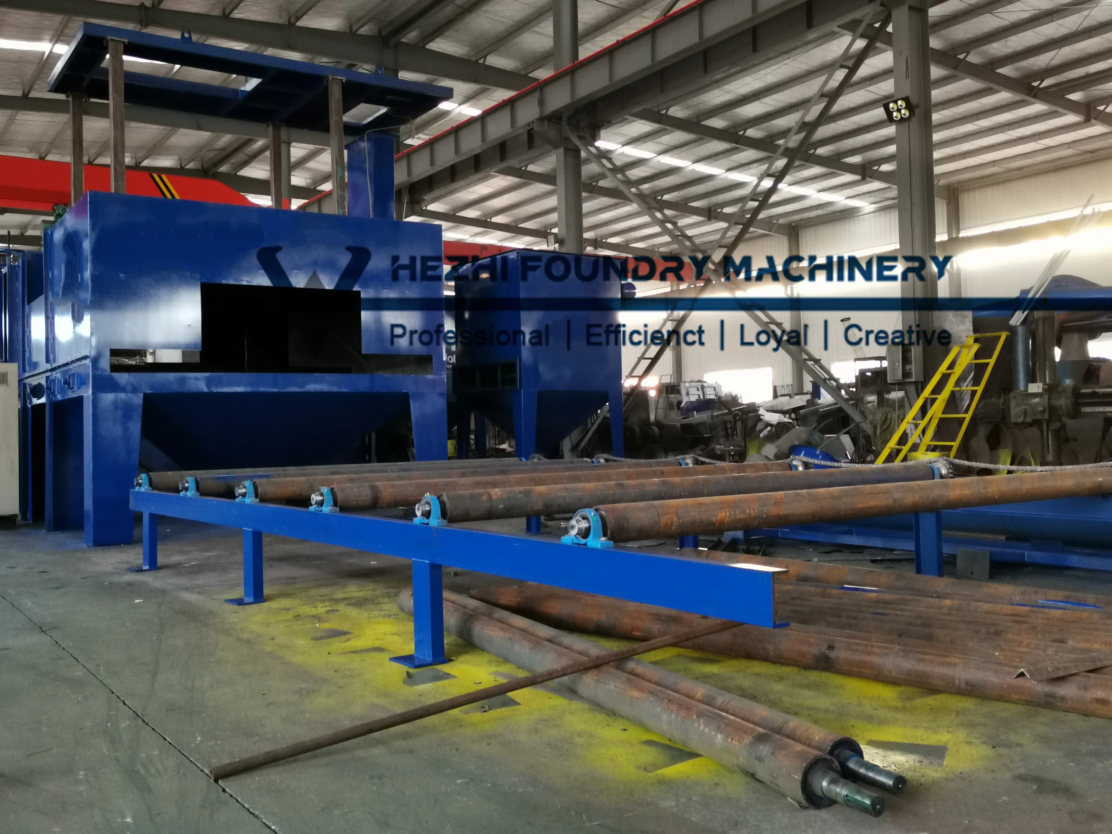 Work pieces include H beans, I beams, steel plate, sheets and strips, square tubes, tubes and pipes, bars and rebars. Fabricated steel works and structural steel works can be blasted thoroughly to reach SA 2.5 or even SA 3.0 ready for priming and coating.