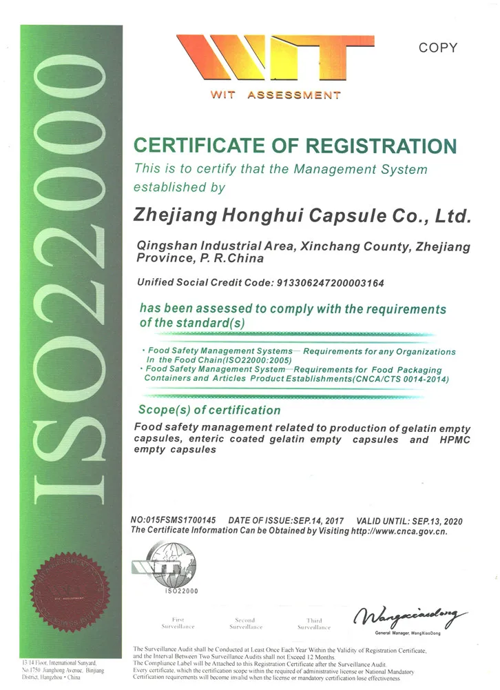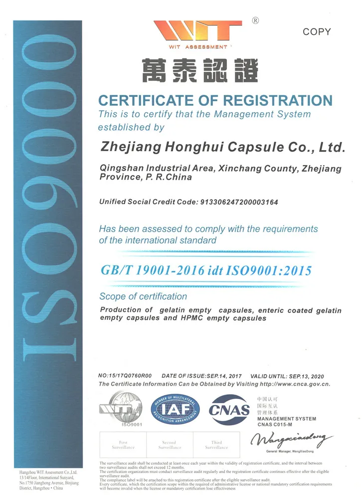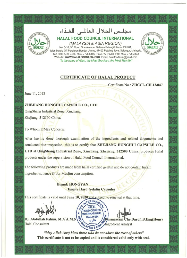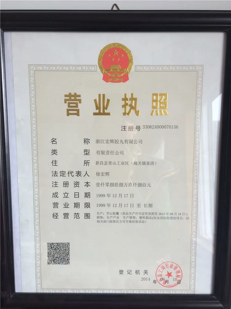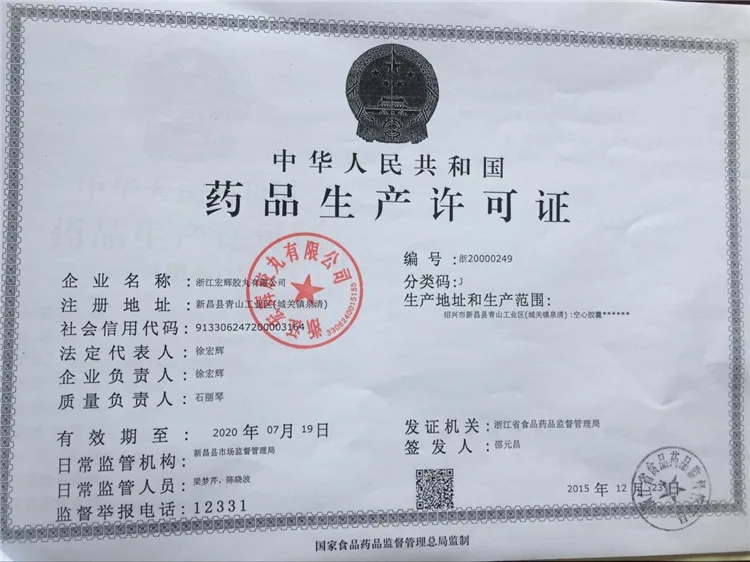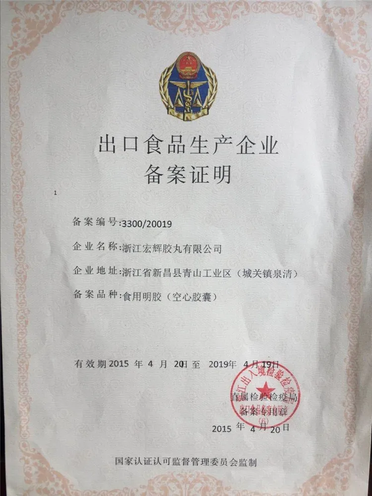 Zhejiang Honghui Capsule Co.,Ltd. is a professional manufacturer of empty capsules which is founded in 1995; with covering a total area over 20,000 square meters. We are specializes in producing gelatin,vegetable,enteric coated and pullulan hollow capsules from the size 00#-4#. By now the annual capacity of the production reached 28 billion grains.