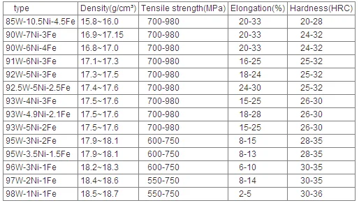 W(88-98)% with the addition of nickel and copper or nickel and iron ,etc.