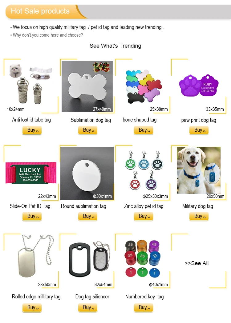 Our tags Features | Non-fading, wear resistant, eco-friendly, lightweight, fast delivery, economical shipping fee, low moq, accepting mixed color for low moq, customize logo, colors, shapes, do sublimation blank tag, complete pet accessories, choosing different shapes pet tag free samples. |