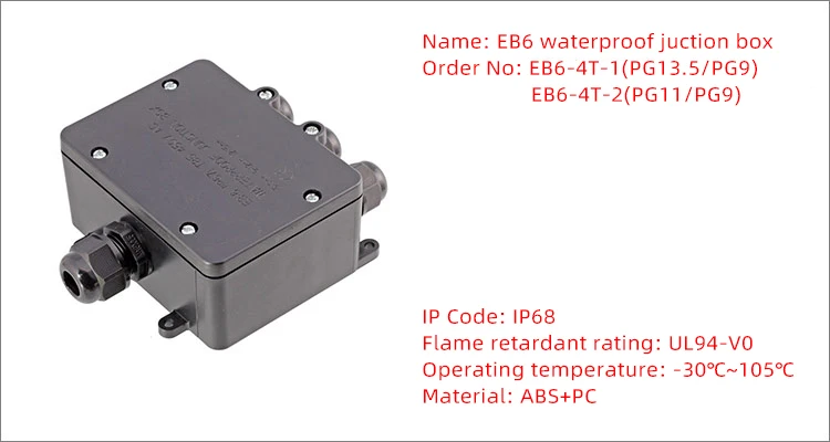 Product description: Model name: waterproof box Brand:EAE Model number :EB6 Cable gland Wire range:4-8mm Matarial :pp That Waterproof box he two kinds-4T,They are suitable for all kinds of outdoor lamps and lanterns, fire retardant, and waterproof and dustproof