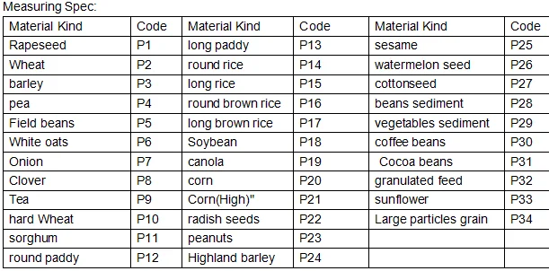Measured object | food and other non-metallic particulate sample (See "variety, and code table") |