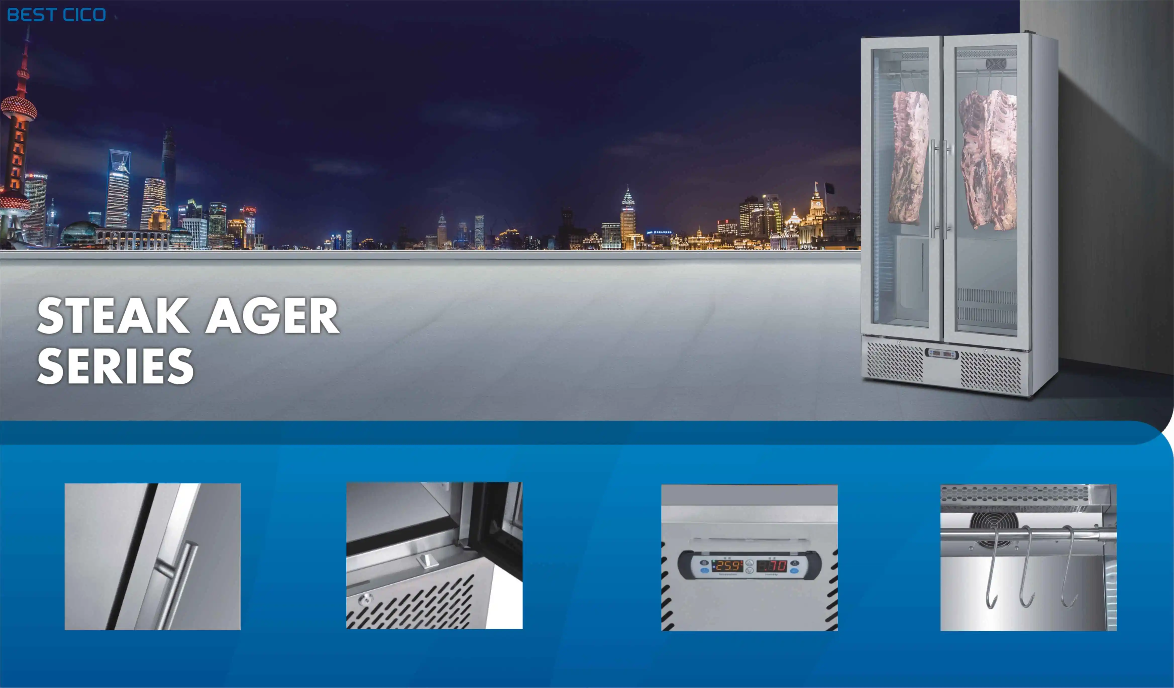Inside the fridge, the meat ages on the bone at a cons tant humidity of around 85% and a temperature of 2 °C. The precise electronic control system of the can be set in pr ecise 0.1 °C increments. The humidity is also controlled accurately through the integrated HumiControl sytem, which can be set between 60% and 90%. This guarantees, together with the DX AirReg system, a perfect micro-climate, an ideal air-flow and continuous sterilization inside the CICO Dry ager machine – even when the outside temperature fluctuates.