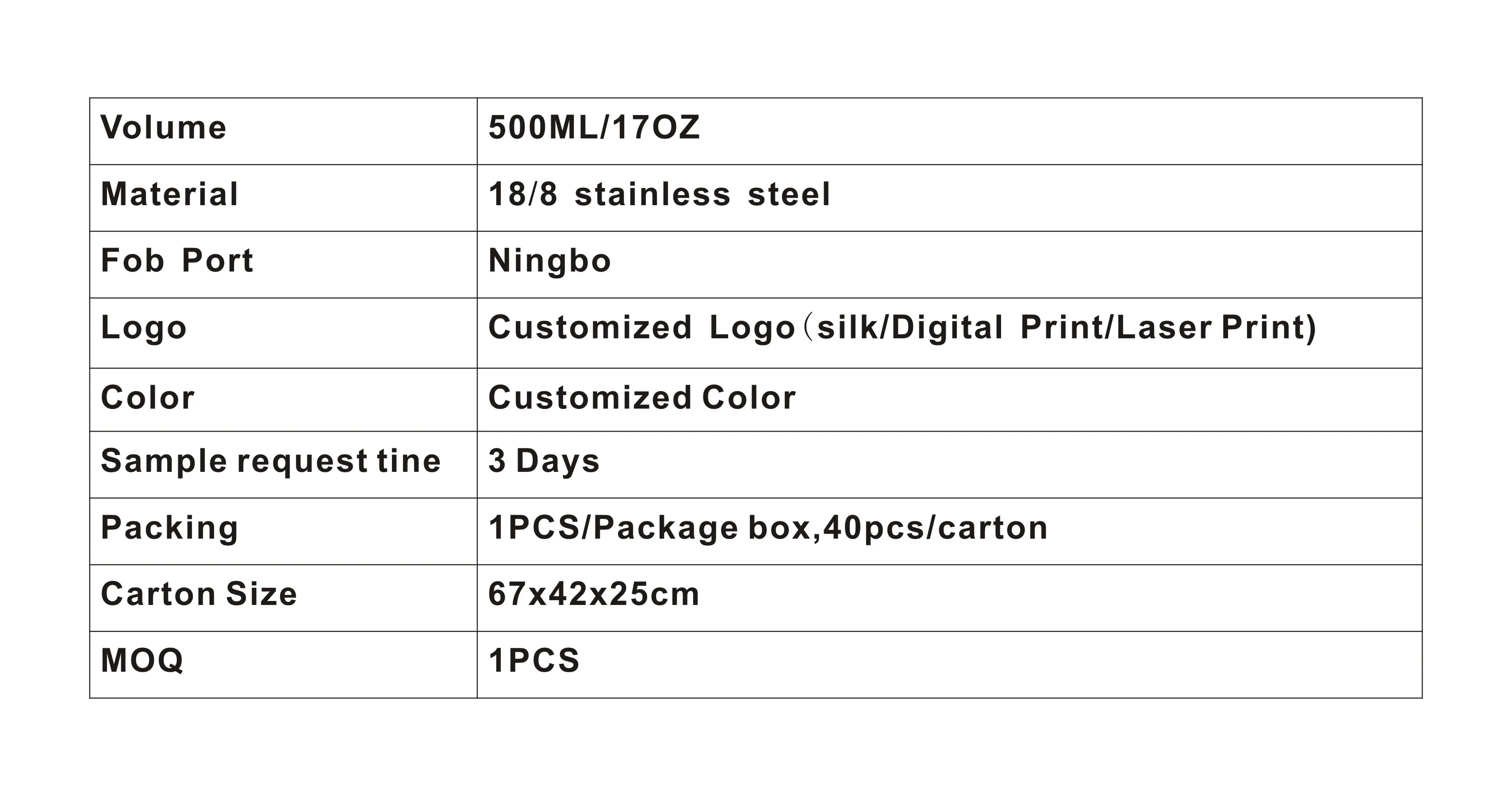 Yongkang Yicheng Commodity Co., LTD is a company which speciality in Vacuum flask,Water bottle, Coffee bottle,Coffee mug,Sports bottle,Travel mug,Beer Growler,Tumbler,Thermos bottle,Thermos Flask,Food jar,Coffee Tumbler,Beer cup and so on.Base is located in Yongkang City, the famous hardware town of China.We have a professional QC team to contral the quality for every steps start from Raw material-- Semi-manufactured goods --finally finished goods. Our products are sold to all over the world.We were issued the ISO9001, LFGB, FDA certificate, meanwhile have approved by BSCI Aduit.