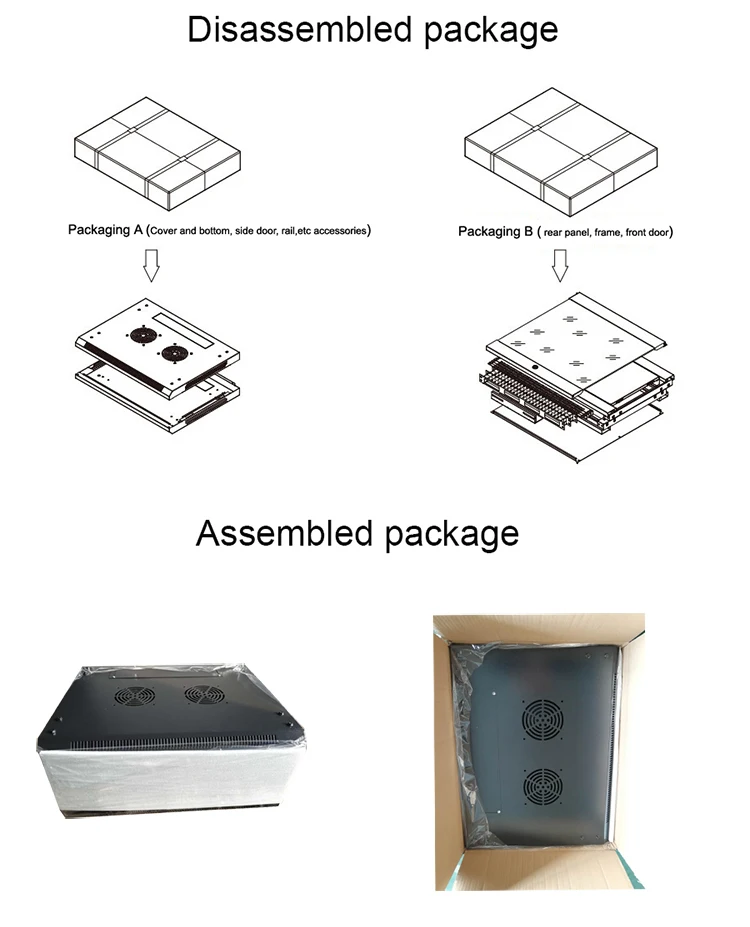 Packing | Disassembled packing in 1carton for 4u wall cabinet, Disassembled packing in 2carton for 6u-20u wall cabinet, Assembled packing in 1carton | ||||||