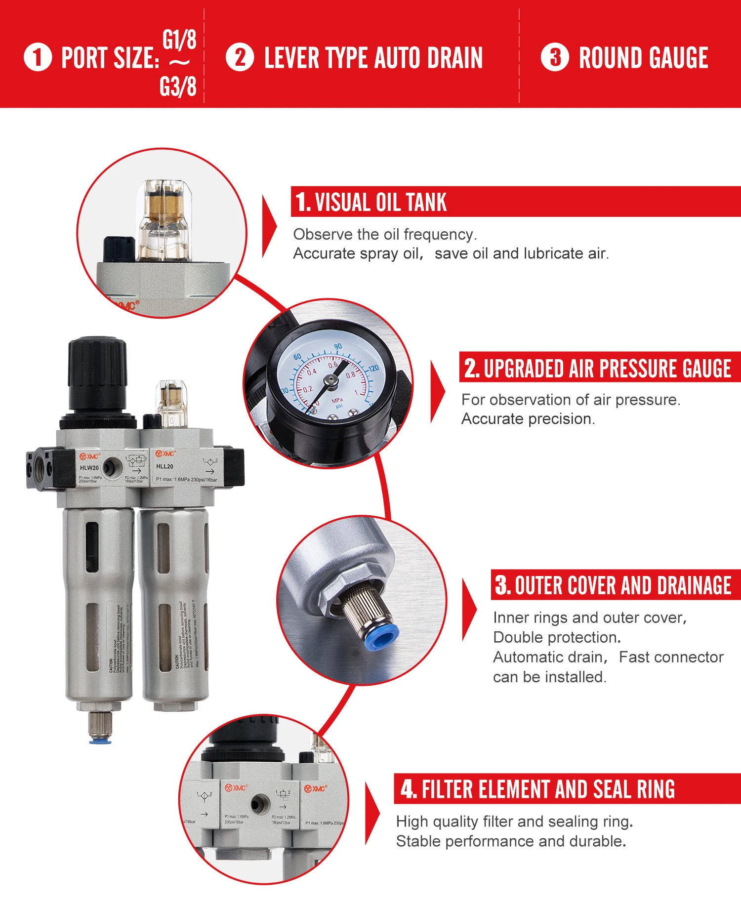 This products can filter upstream dirt , pipe scale, rust and condensate in the air; In special occasions, 40 μm standard filter element can be easily replaced by 5μm filter element. Even the input pressure and the consumption of compressed air caused the system fluctuation, also ensured that the setting work pressure is still very stable.