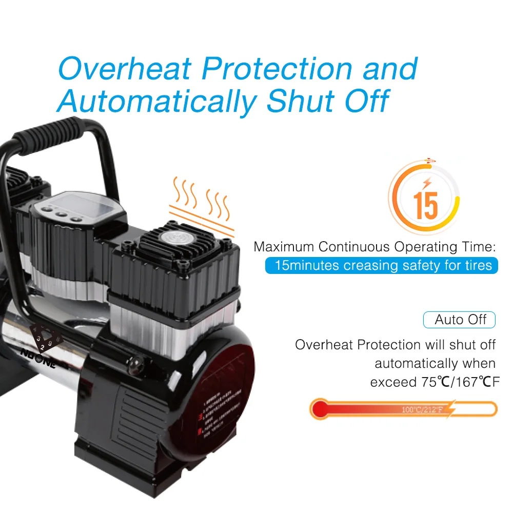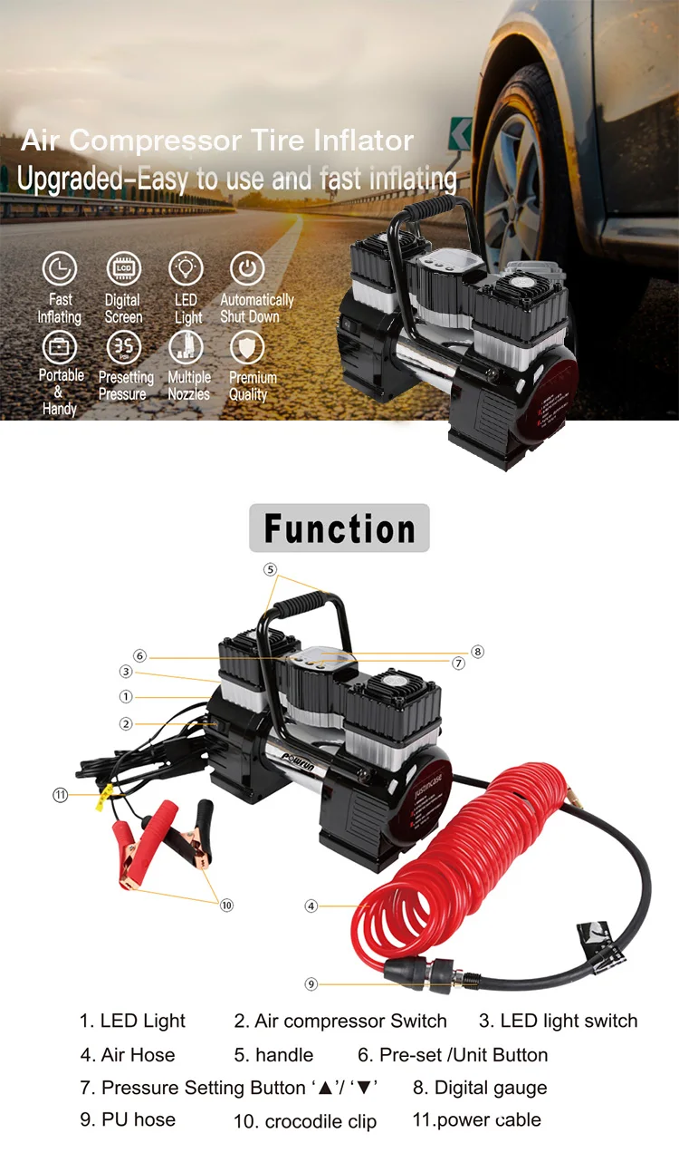FEATURES | a. Powerful double-cylinder motor for rapid inflation b. 3pcs bright LEDs for visiblity in the dark c. Including 3m power cord with battery clamp & 5m coiled air hose with quick connect d. Comes with hand case for easy transportation e. Programmable output setting |