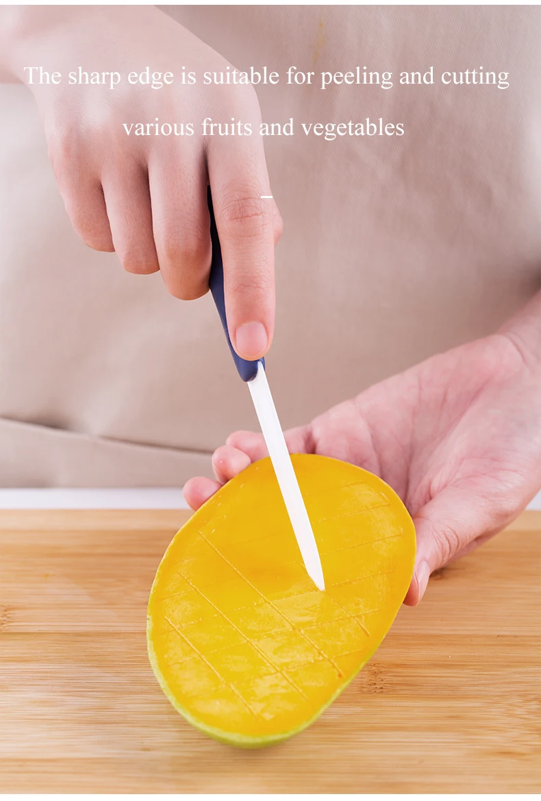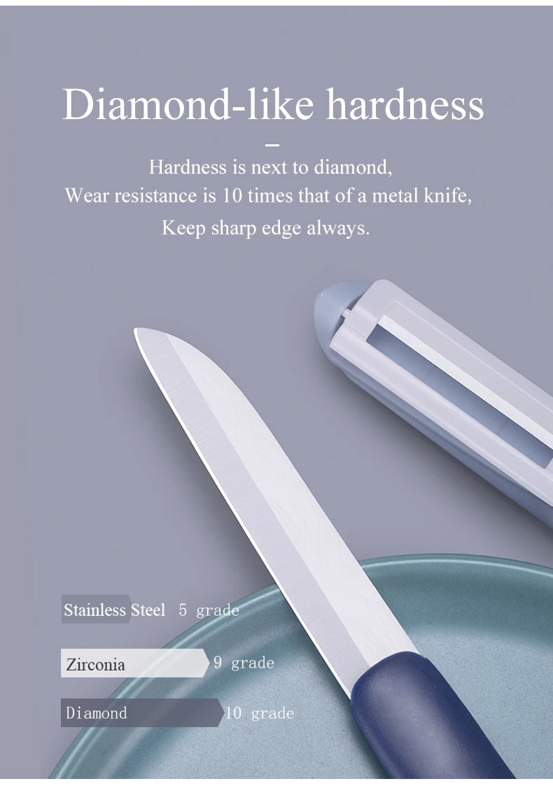 Feature | 1. 2 in 1 peeler knife set design,multi-functional and fashionable; 2. Durable, Ultra-sharp edge, strong enough,passed drop test; 3. It is handy, safety, environmentally-friendly and hygienic; 4. Blade is made from high purity Zirconia which is anti-bacteria, anti-fouling, non-toxic and non- corrosive; 5.Unique flame texture technical patent. | ||||||