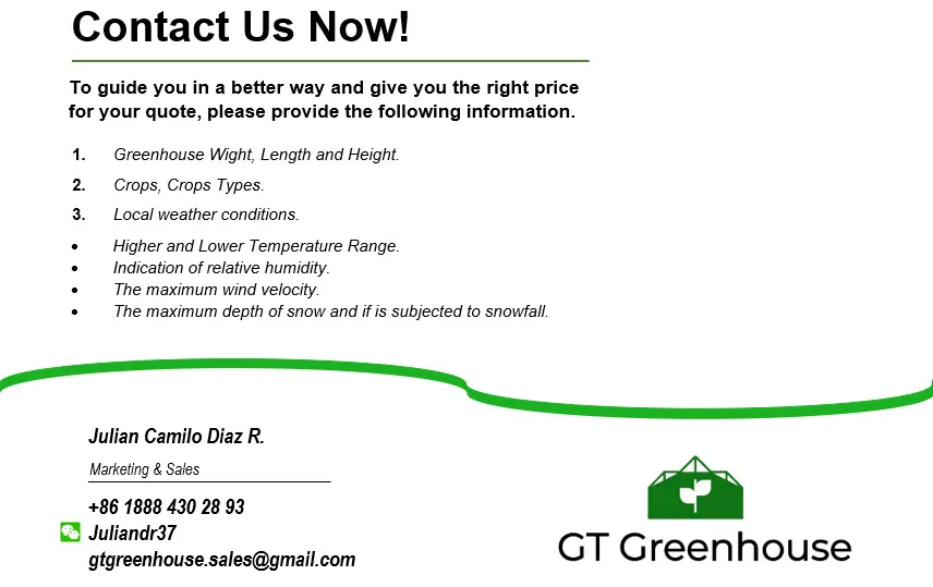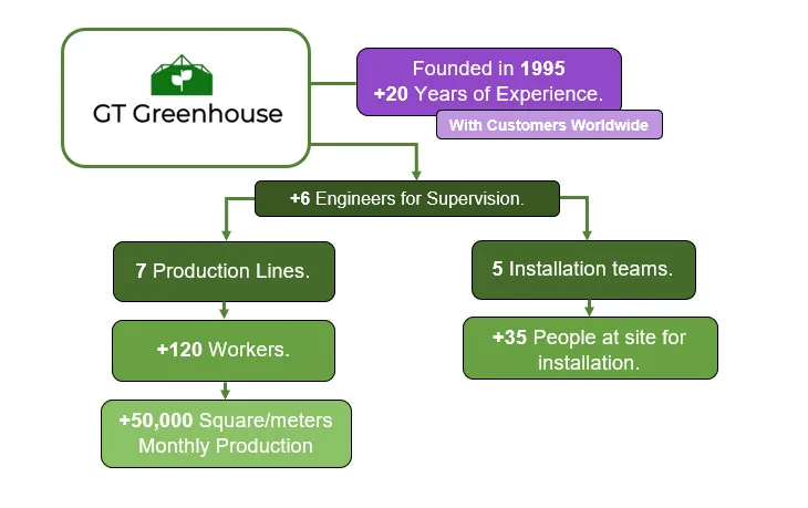 We are a Greenhouse Company, from chengdu,China that was founded in 1995,our principal customers are located in North and South America, Middle East and Asia, we have a variety of products like, Blackout Greenhouse, Glass Greenhouse, Polycarbonate Greenhouse; we work with the best technology and our team is very capable to support you and solve any question that you have,