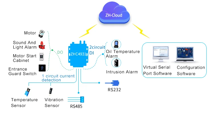 ZHC4931 can communicate directly with the client server after simply configured. The ZHC4931 follows the Modbus RTU/TCP protocol and also supports 485-channel transparent transmission protocols.