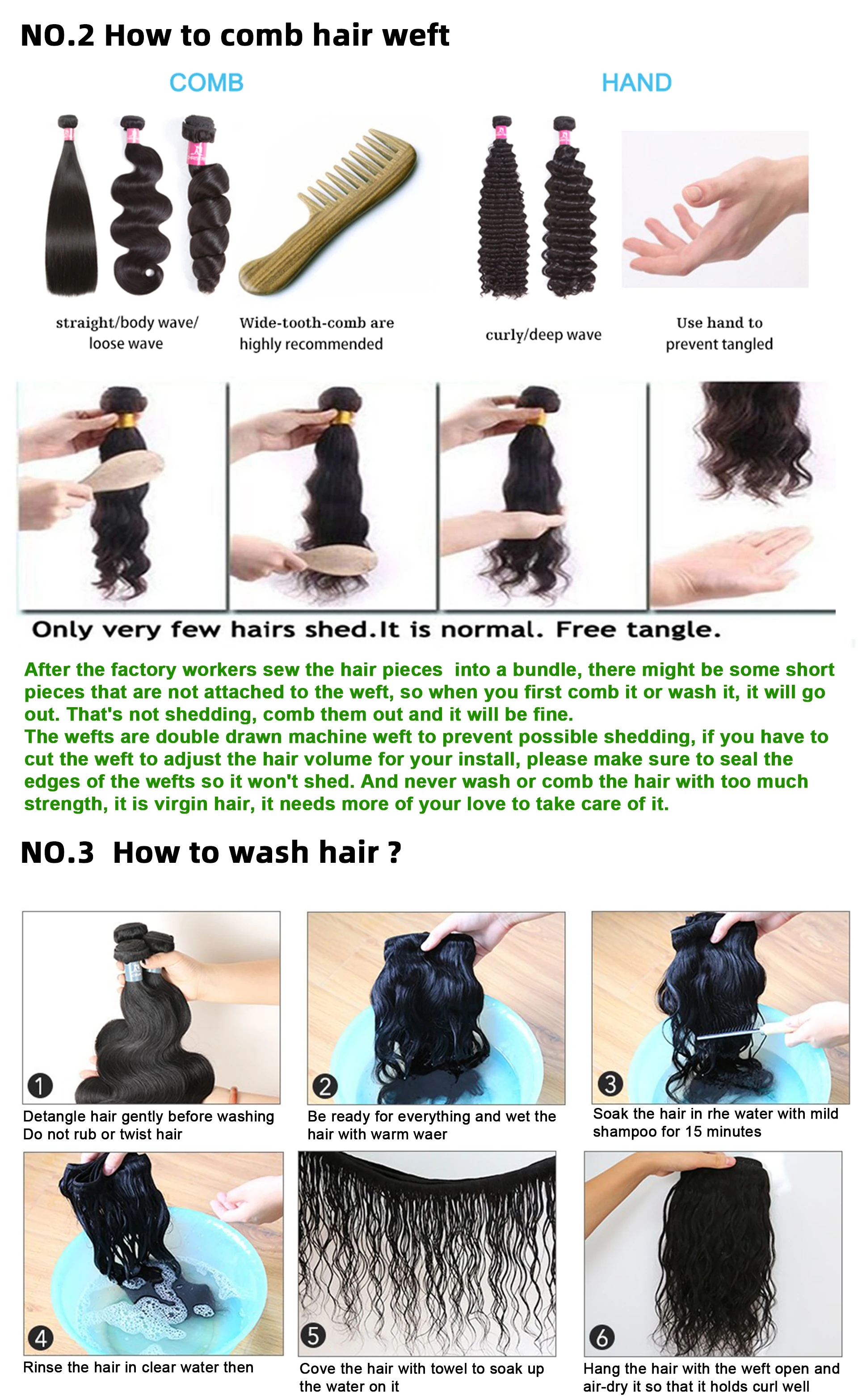 1.we choose the hair must 100% human remy or virgin hair no mix 2.No tangle&shed , when you wash,it not knot.