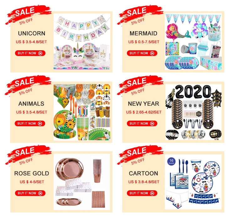 Paper cups, plates, hats, napkins,horns,blowouts,cake cups, table cloth etc.,.
