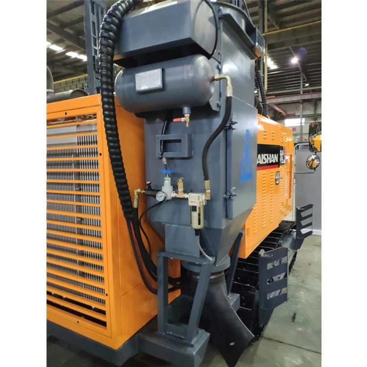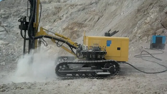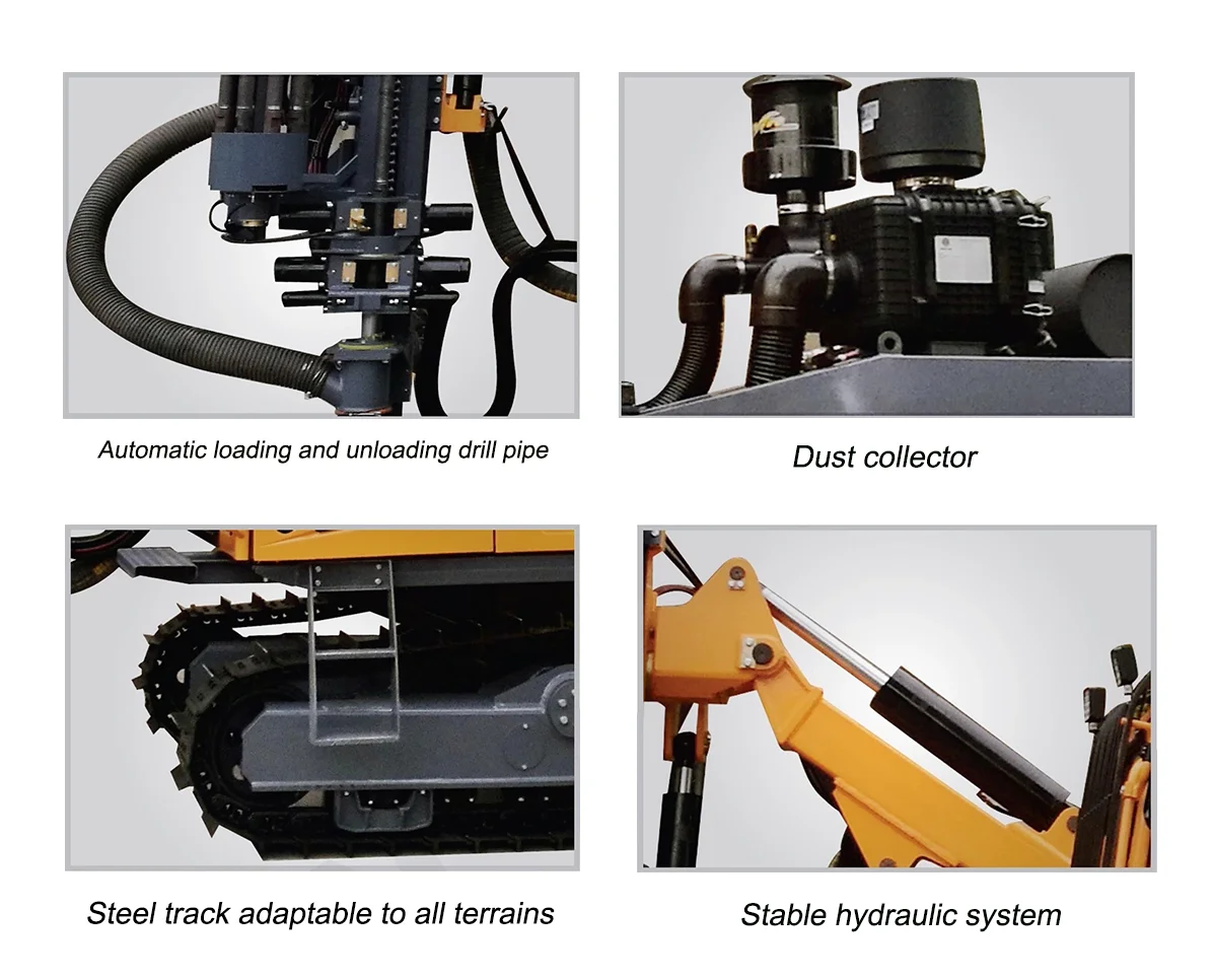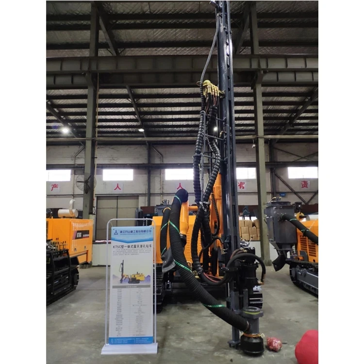 The ZT5 integrated down the hole drill rig for open use is a new drilling device developed by kaishan group after years of development and production of down the hole drill rig to meet the needs of large open-pit mine. Its travelling, propulsion, rotation and angle adjustments are based on hydraulic drive, thereby proving its powerfulness. The high air-pressure screw nose and high air-pressure pneumatic hammer contribute to efficient drilling. It is equipped with the dry hydraulic dust collector, thus reducing pollution. The hydraulic mechanism is used to dismount the drilling rod, the floating joint to protect the thread of drilling rod, the automatic unloading rod device to relieve labor intensity, the air-conditioned cab provides comfortable space and the anti-jamming valve with automatic control reduces the possibility of sticking. And what is more, the drilling rig is characterized by excellent integrity, high automation, efficient drilling, environment-friendliness, energy conservation, simple operation, flexibility and travelling safety, etc.