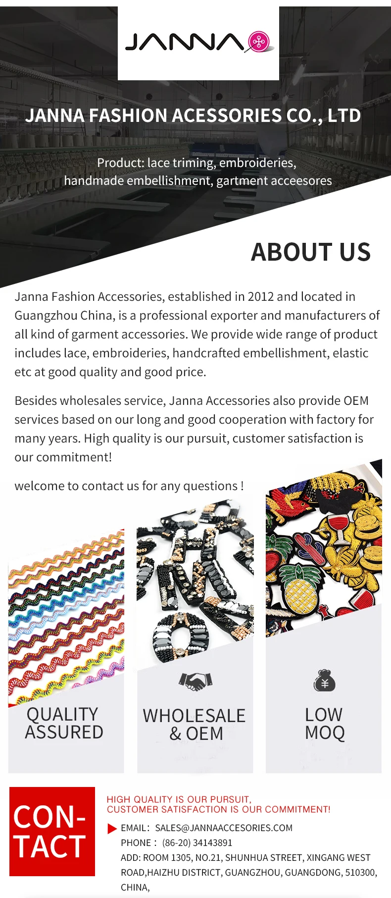 Janna Fashion Accessories, located in Guangzhou China, is a professional exporter and manufacturers of all kind of good & high quality garment accessories and mbellishment, including lace, embroideries, handcrafted trimming, elastic. welcome to contact us.