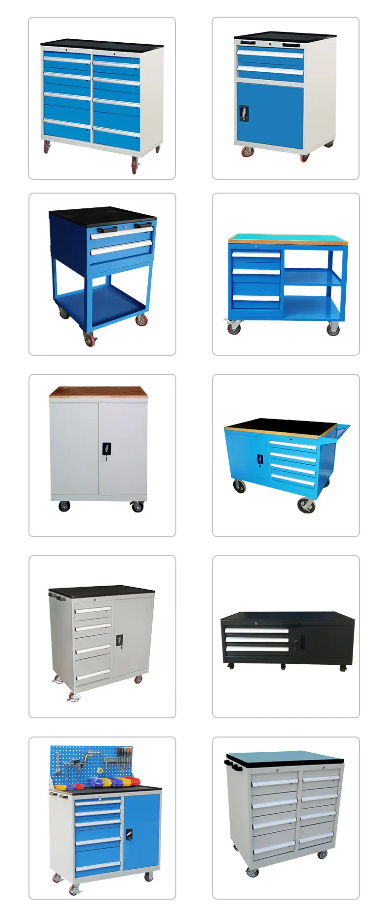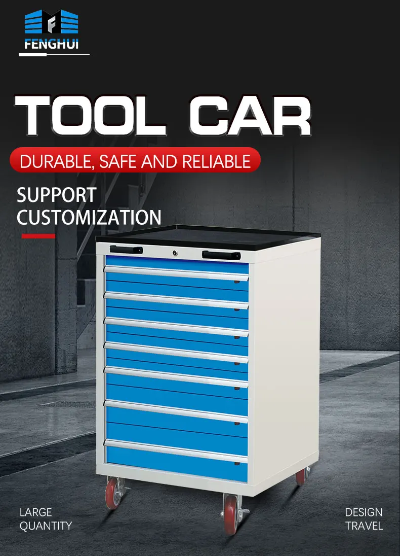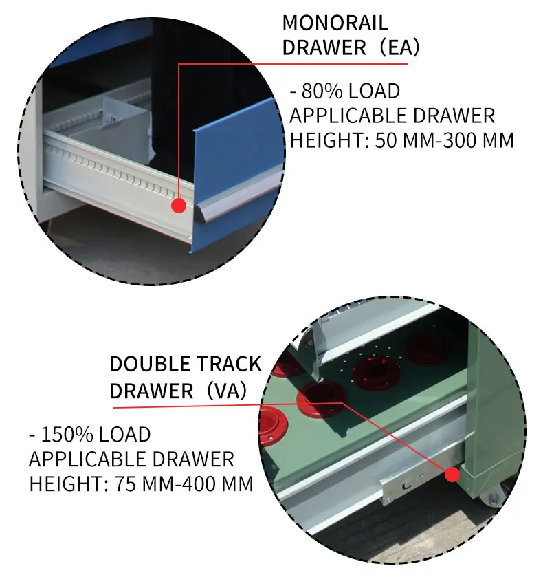 Tool car height = tool cabinet height + top frame 20 mm + bottom caster; The monorail drawer is equipped with 4x1.25 "caster height of 130mm as standard; Double track drawer is equipped with 4x2 "caster as standard, with a height of 150 mm; The number of drawers can be customized according to customer needs; |