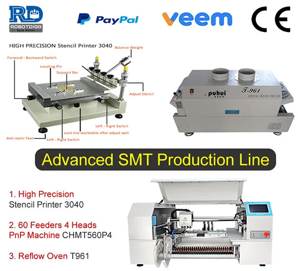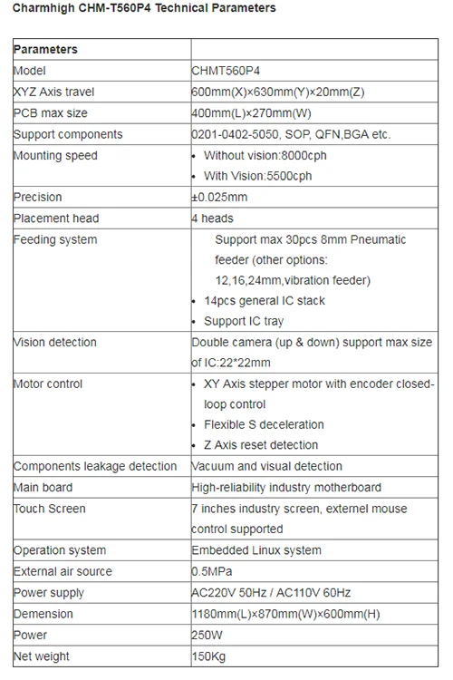 CHMT560P4 is multifunction pick and place machine which can load traditional pneumatic feeders, the precision and speed are surely better than CHMT36VA or CHMT48VB benchtop type Not only because of the working principle but also for small SMT components 0201 or 0402. The pick and place machine CHMT560P4 together with T-961 reflow oven and the 3040 classic stencil printer is the cost performance SMT production line for batch production IoT or LED, etc.