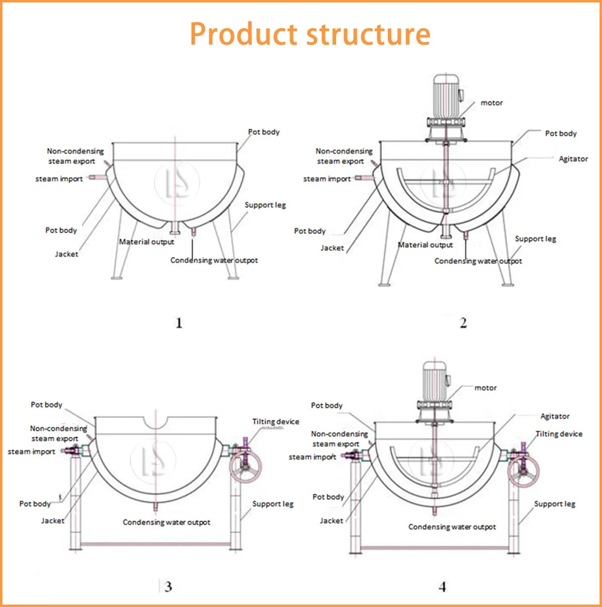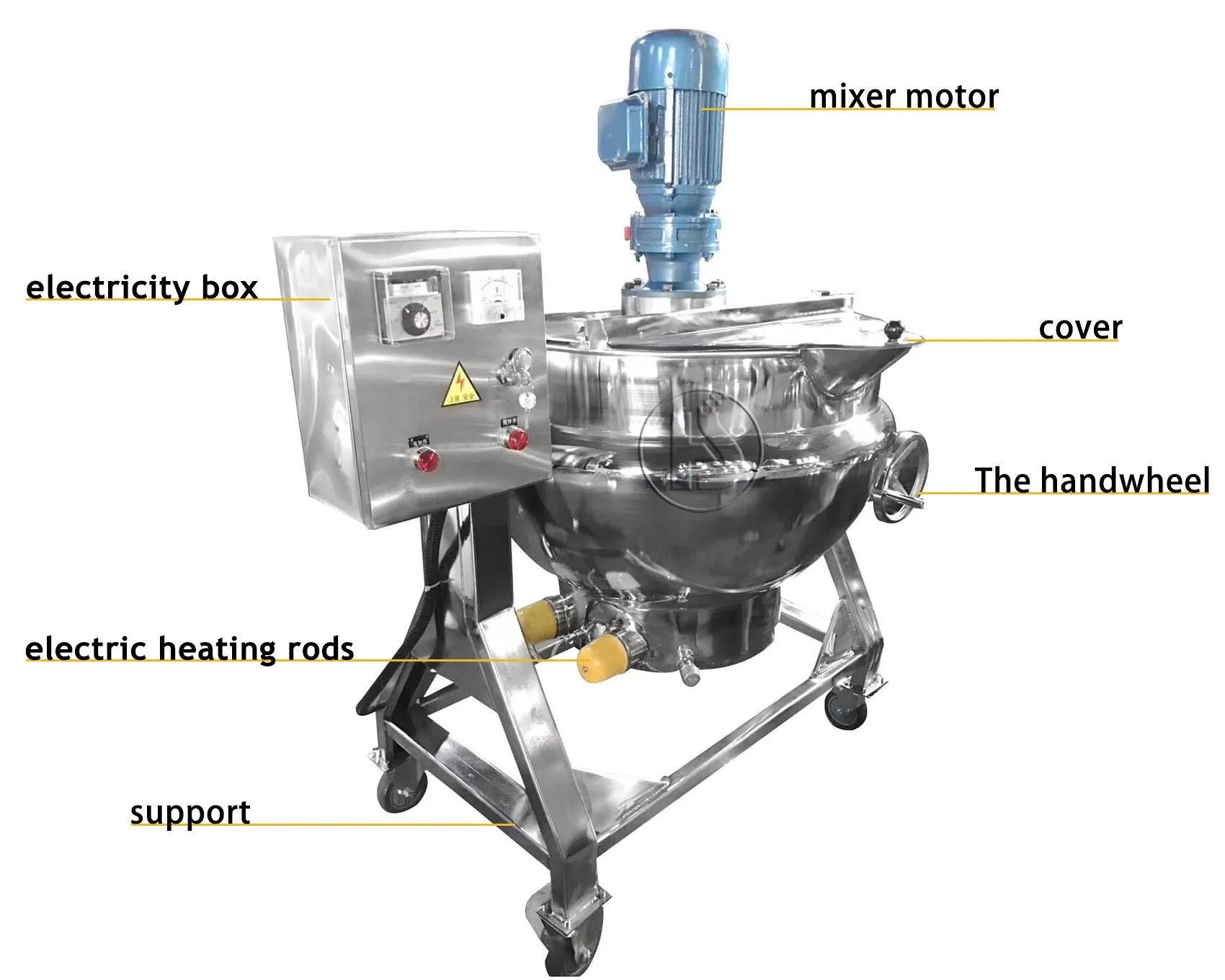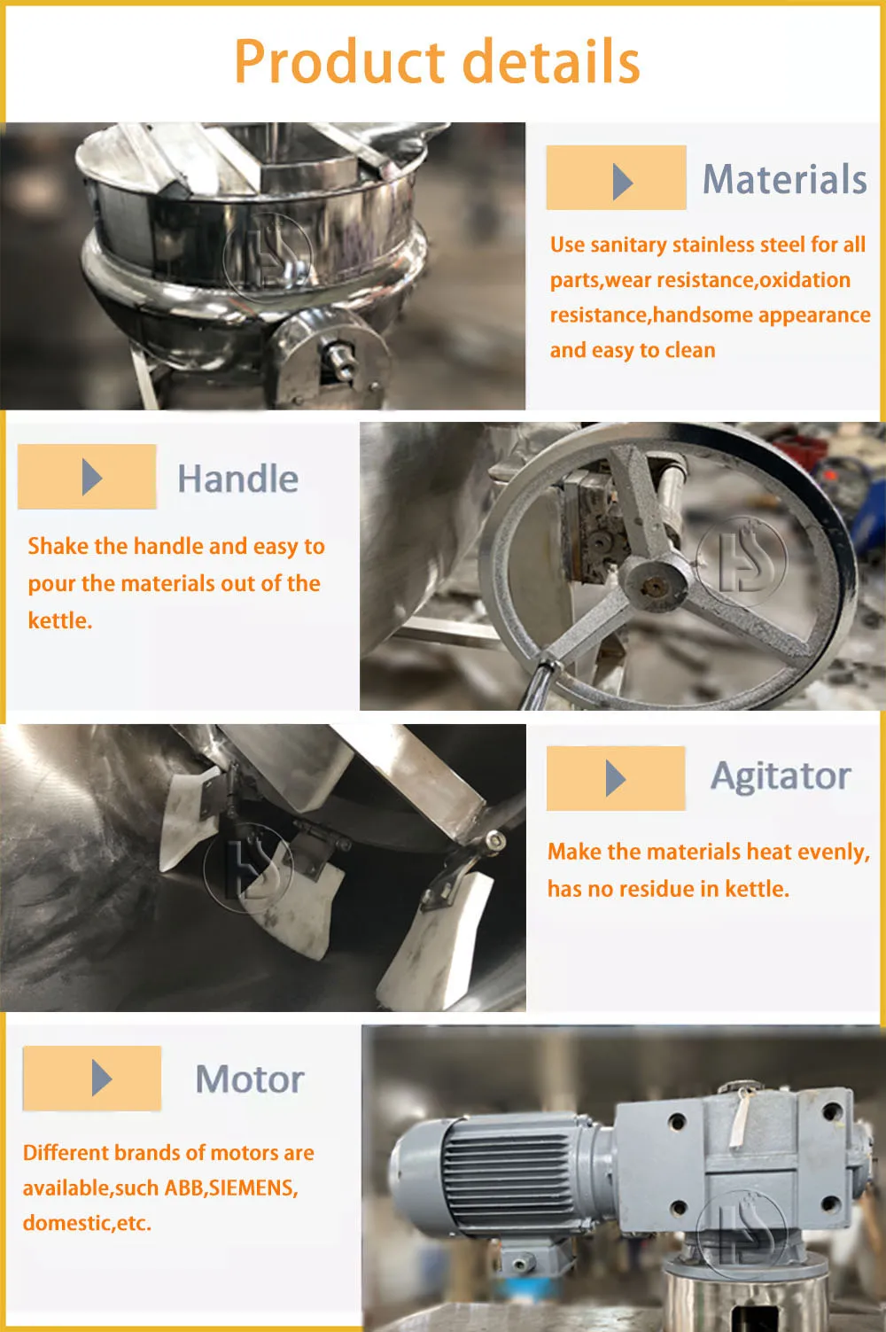 Huashang jacketed kettle is composed of kettle, bracket, turbine wheel and turbine etc. The kettle can revolve in 180°, The equipment is used for open concentration, mainly for decocting and concentration of liquids for industries of pharmaceutical industry, food industry. Widely used in candy, cakes, drinks, fruit juices, jams, preserves, dairy products and other canned food processing and brewing, wine, pharmaceuticals, household chemicals and other industries. Contact area of the equipment with materials is made of stainless steel SUS304, SS316L, which has perfect corrosion-proof performance, and is highly endurable according to GMP requirements. Blender also can be matched according to customer requirements.