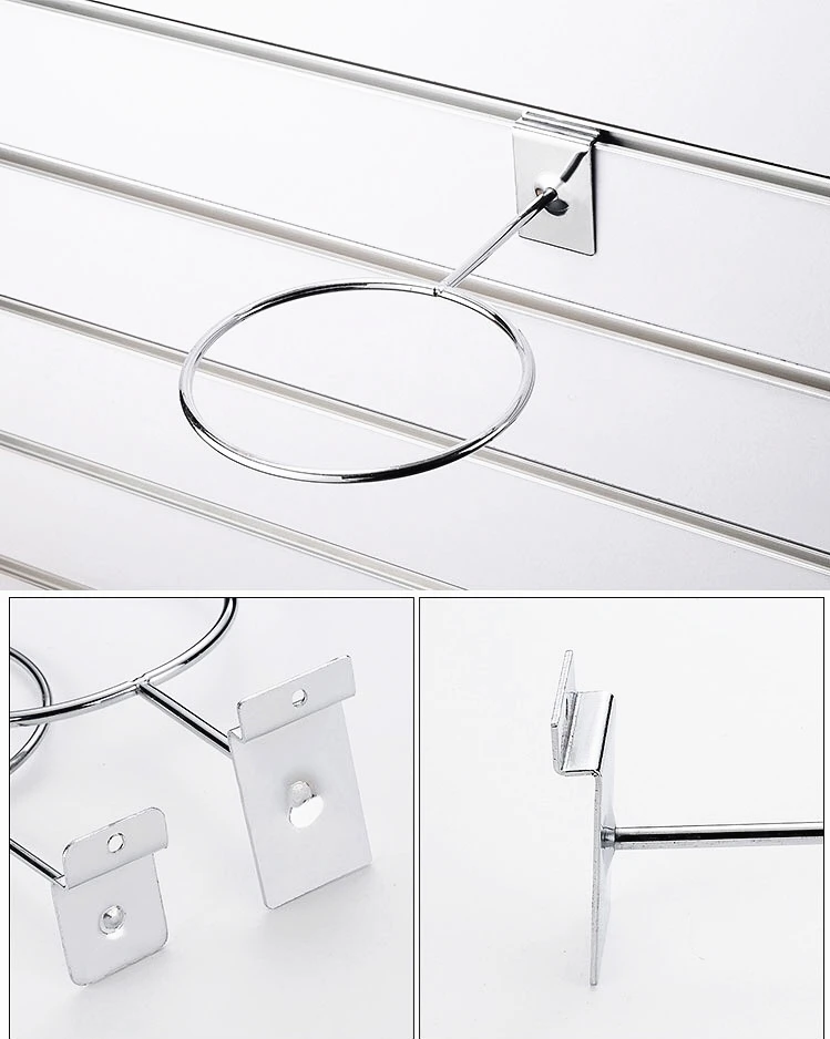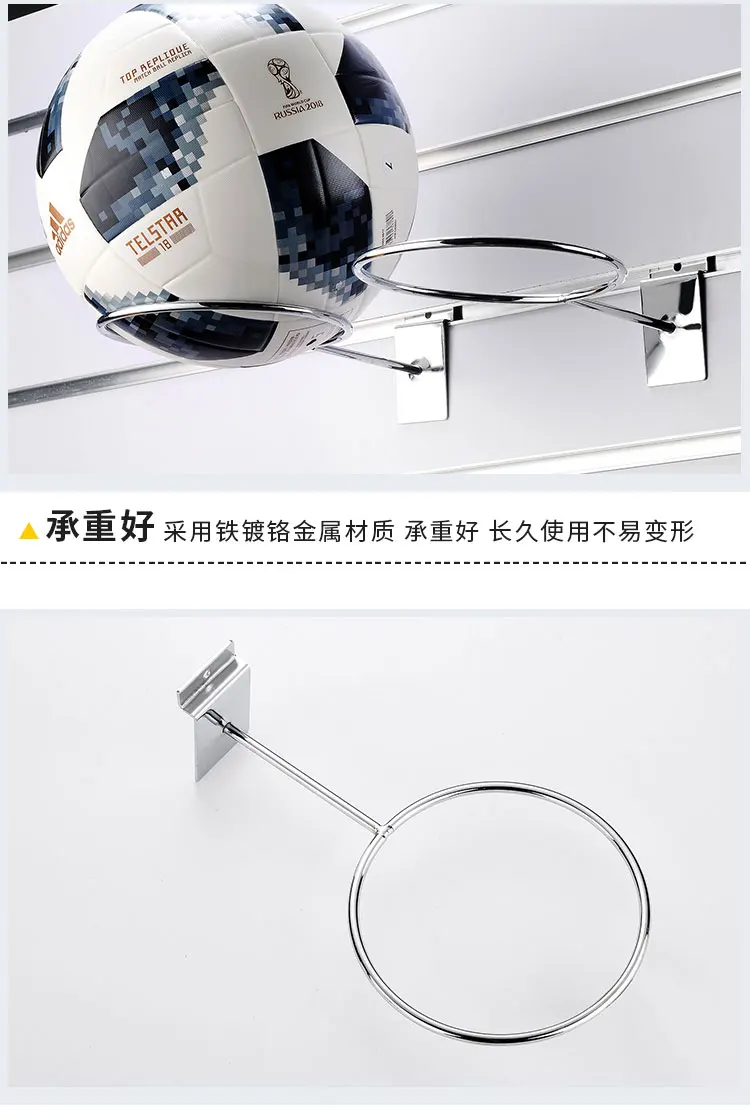 Bring attention to your product display with our Slatwall Ball Display Ring. This eye catching display is designed to fit slatwall panels and is constructed of steel wire with a black finish. The 6" diameter ring will hold basketballs, soccer balls, volleyballs, footballs and more. Perfect for cross merchandising sports apparel and equipment.
