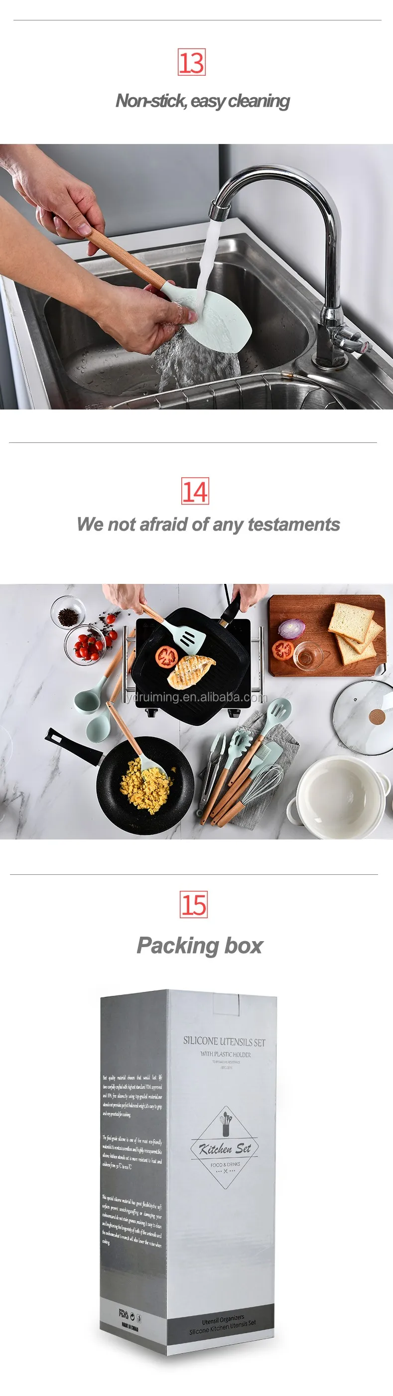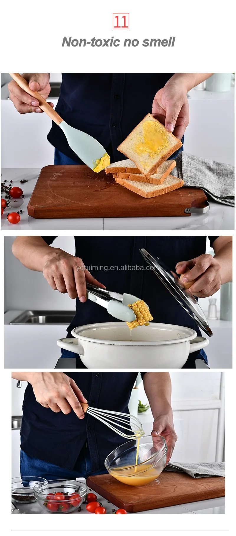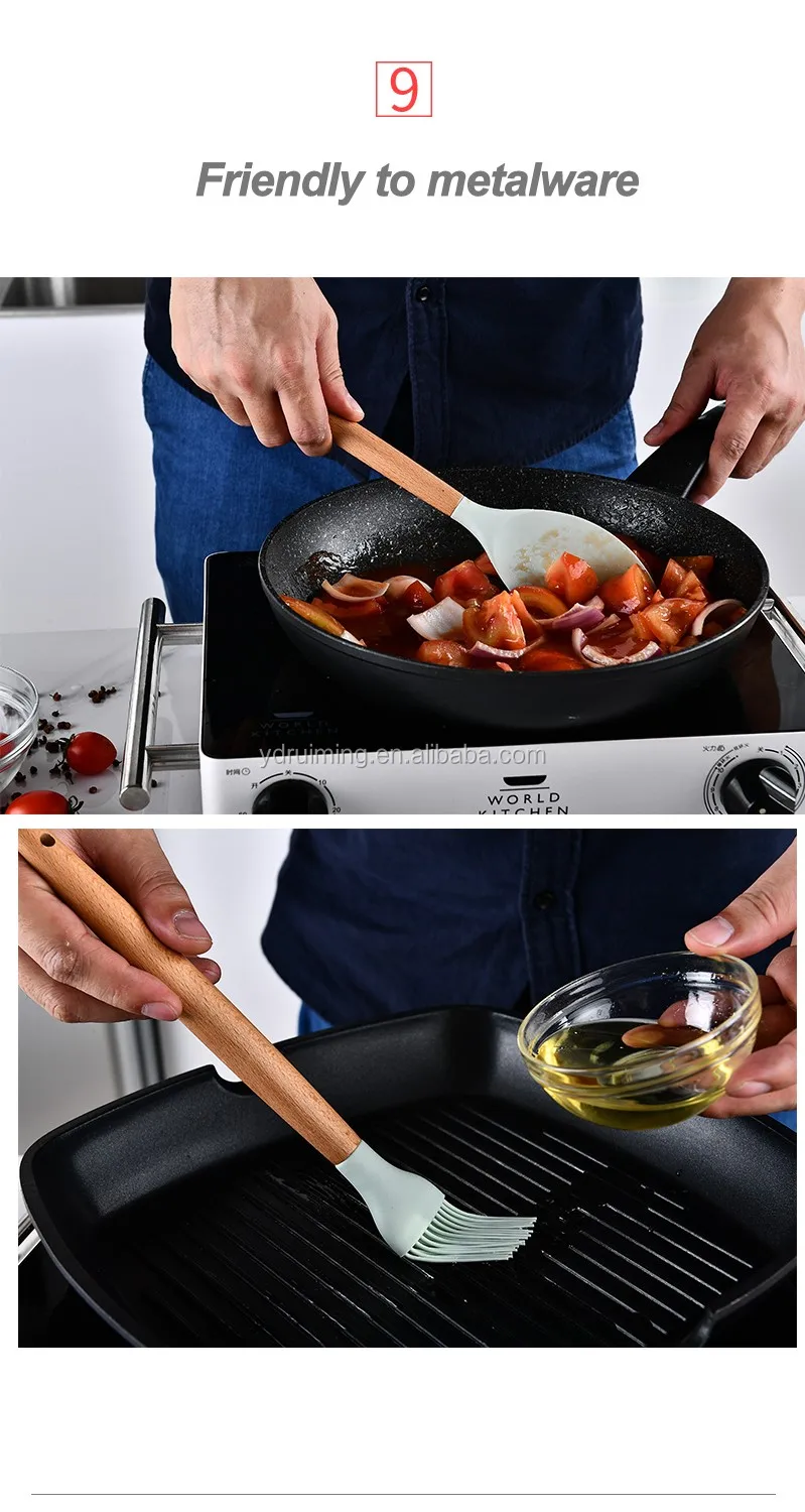 * Food grade silicone heads with wooden hanlde. Every piece is good quality and safety contact with food.