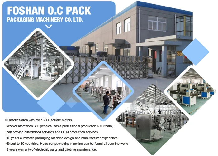 Ocpack Packing Machinery is located in Nanhai District, Foshan city, with plant area of over 6,000 square meters, respectively producing 3 main categories of packaging machines: large vertical packaging machine, small vertical packaging machine, and pillow packaging machine. And the main popular products are granules packing machine,powder packing machine, tea bag packing machine,liquid packing machine,puffed food packing machine, gift box packaging machine, fresh fruit and vegetable packaging machine and etc., exported to Southeast Asia, Europe and the United States, South America, the Middle East and so on, getting the users of praise.