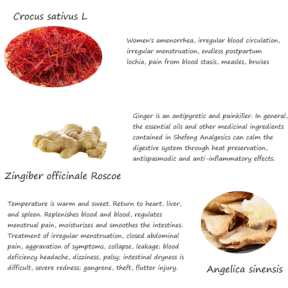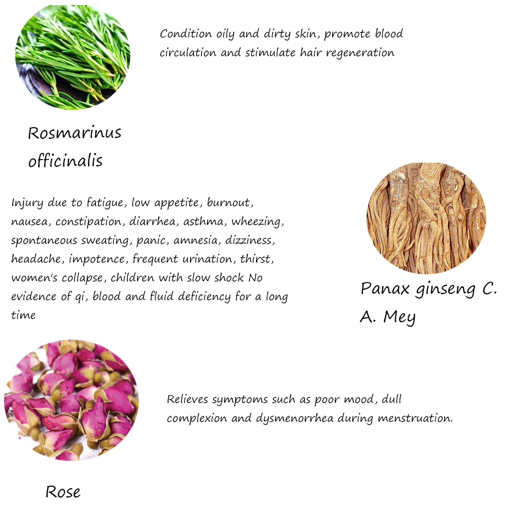 Ingredient | Safflower, angelica, ginger root, rosemary, atractylodes, rose and other ingredients etc. |