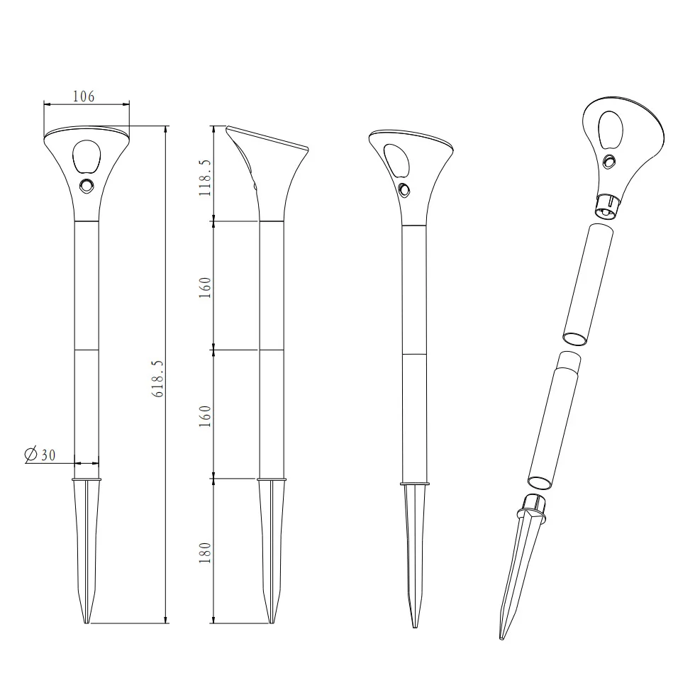 Solar LED Garden Spike Light 1. Solar photovoltaic lighting, no wiring, low voltage, safe, high conversion efficiency, energy-saving. 2. Good SMD light source, super bright, high CRI, long lifespan. ABS shell, UV-resistant, anti-corrosion, IP65 rating. 3. Photosensitive control+PIR sensing modes, automatic smart control, the light charge during the day and discharge in the evening. 4. Optical reflection, trapezoid light distribution, perfect lighting effect. 5. Three section connecting pipe design allows flexible installation height selection.