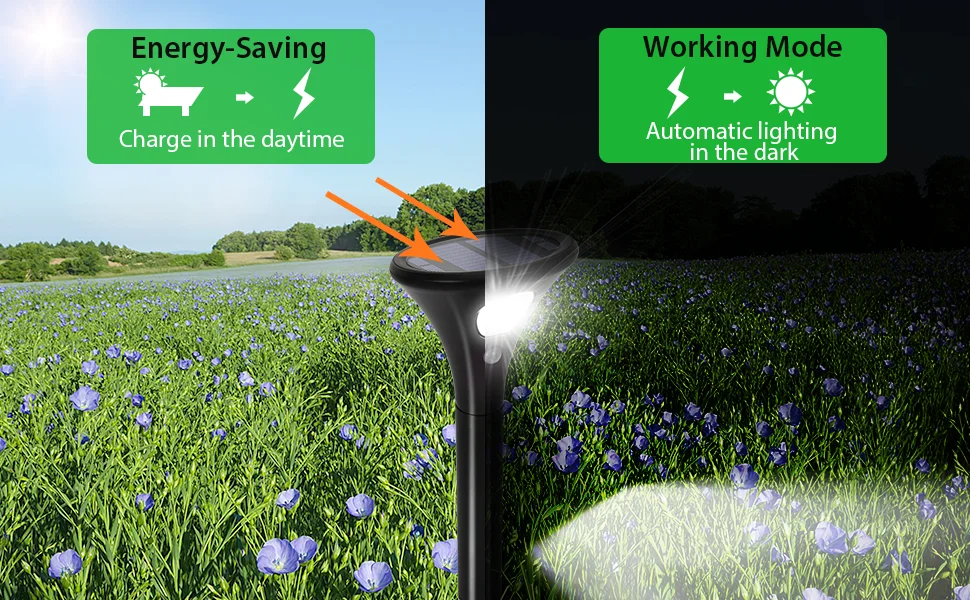 * High Efficiency and Ecological: with the built-in 1500mAh rechargeable lithium battery, the solar panels absorb solar energy during the day for night lighting. When the solar lights is fully charged (6-8 hours), it can work for up to 100-120hours (low light mode) or 10-12 hours (strong mode).