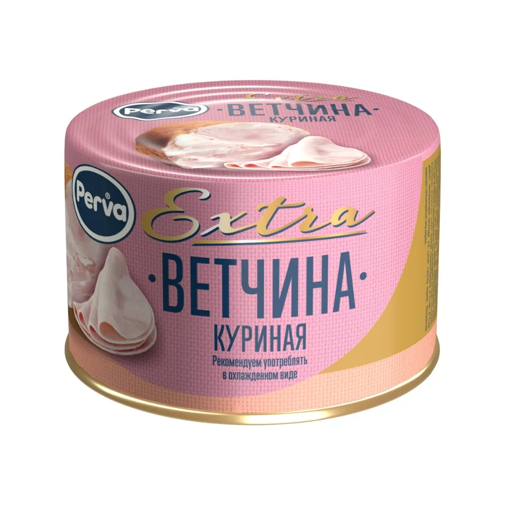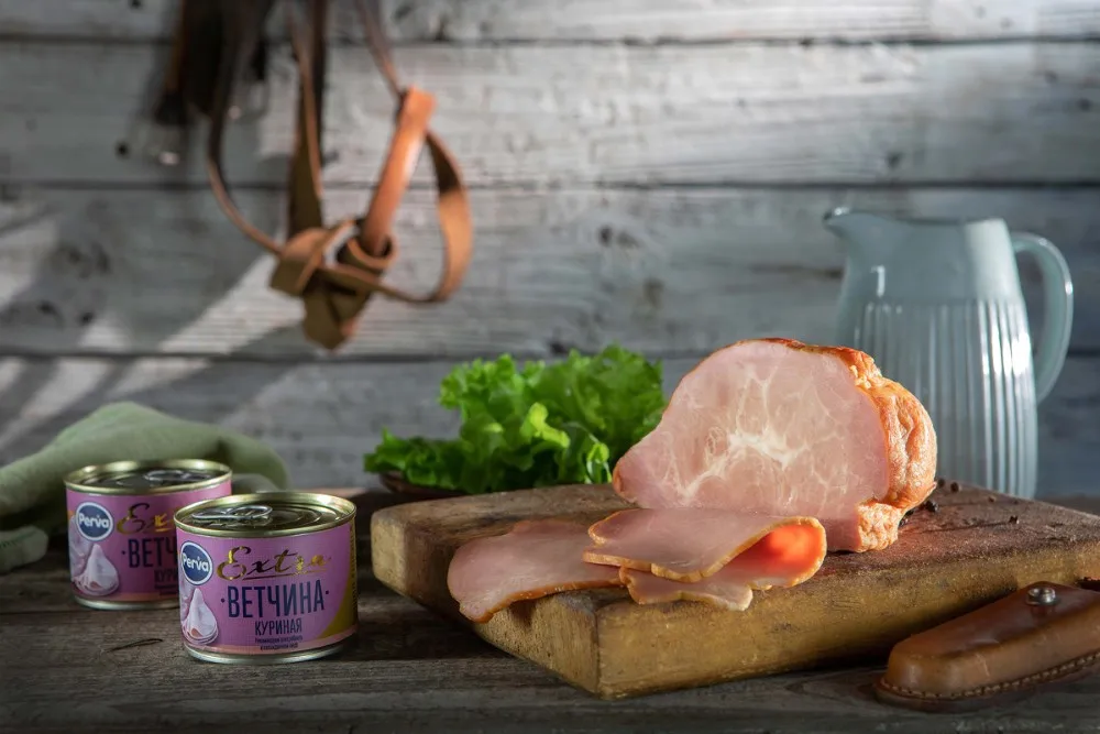 Ingredients: boneless chicken meat, brine (water, nitrite salt (common salt, coloring fixative E250), water-bearing complex food supplement Milmix 2035 (acidity regulator E451(i), stabilizers E452(i), E407, gelling agent E508, thickeners E410, E415, antioxidant E316, maltodextrin), stabilizer E450, sugar), pork skin.