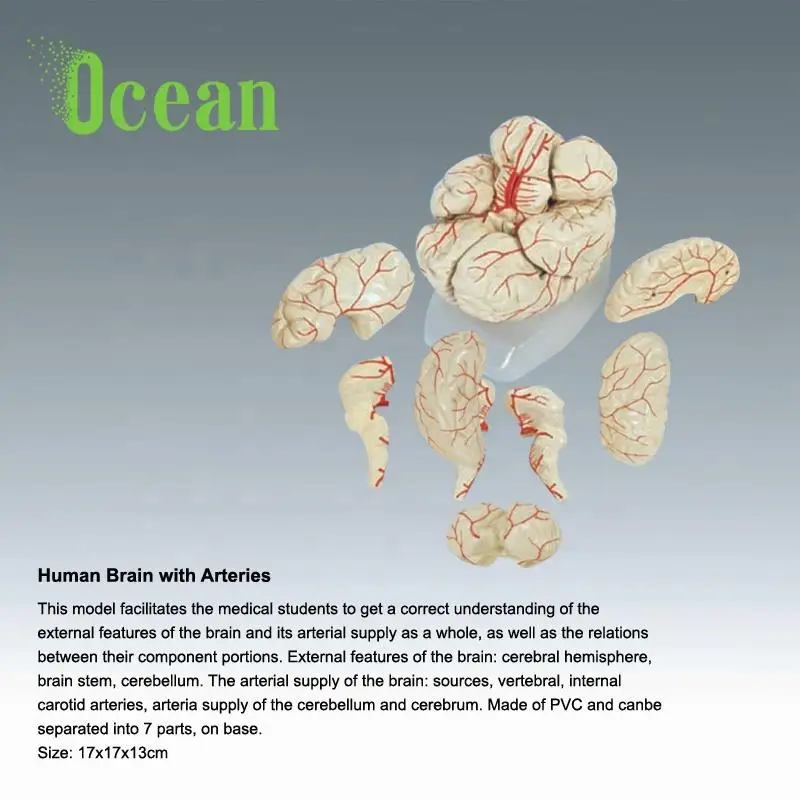 This model facilitates the medical students to get a correct understanding of the external features of the brain and its arterial supply as a whole, as well as the relations between their component portions. External features of the brain: cerebral hemisphere, brain stem, cerebellum. The arterial supply of the brain: sources, vertebral, internal carotid arteries, arteria supply of the cerebellum and cerebrum. Made of PVC and canbe separated into 7 parts, on base.