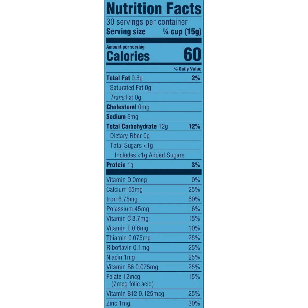 Right now, your little one needs iron to help support learning ability and healthy brain development. Just two servings of Gerber infant cereal meets 90% of your baby's daily iron needs.