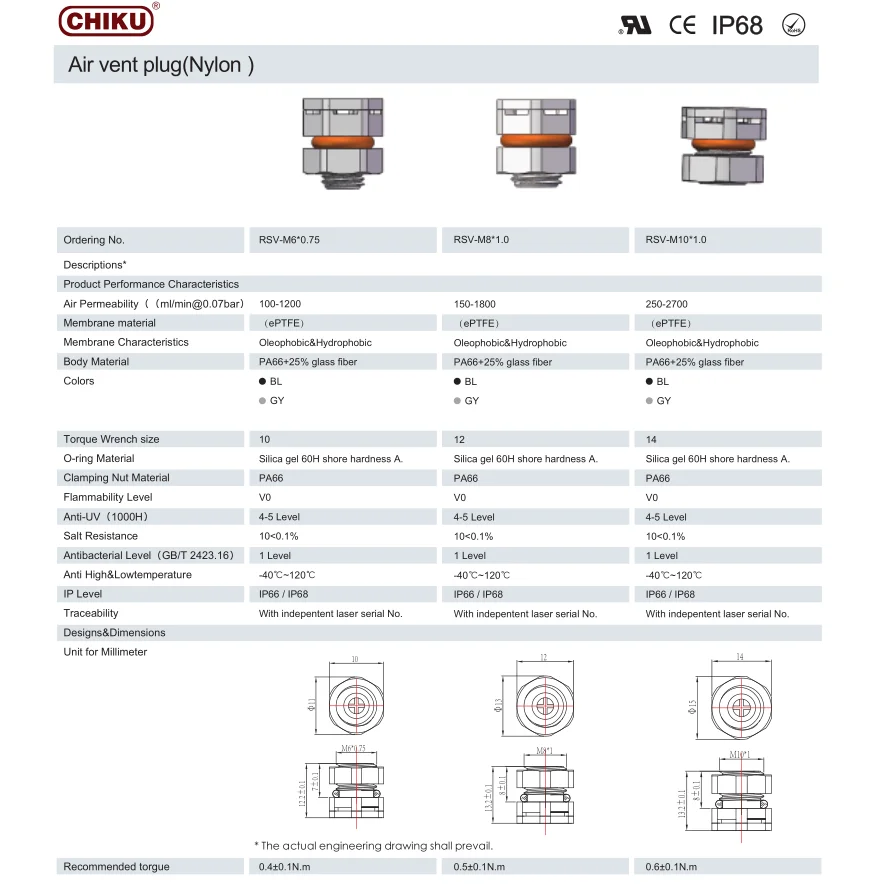 PMF100600 M6*0.75 PA66 nylon screw in vent, waterproof protective vent, breathable air vent plug
