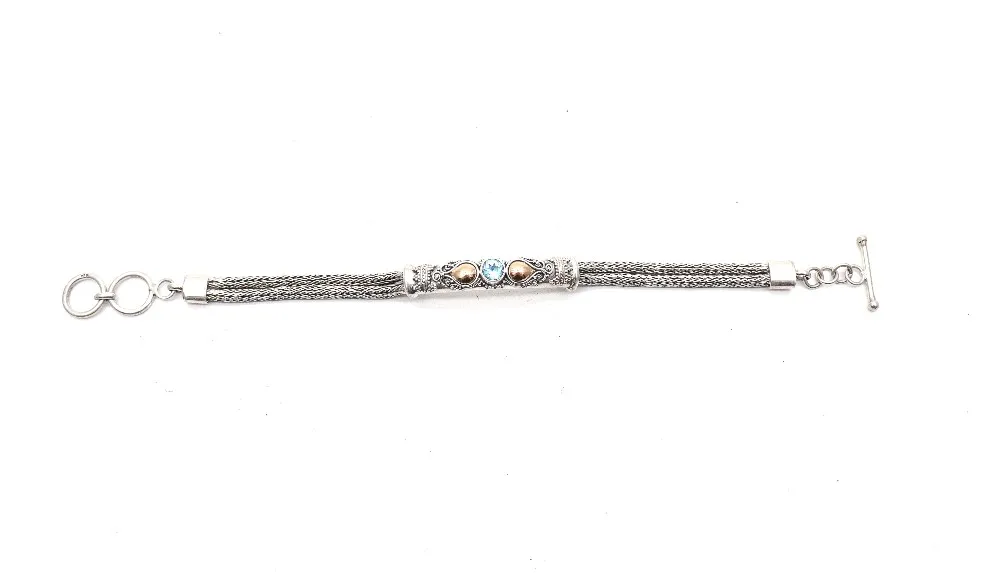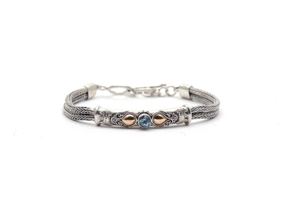 The fusion of braided chains with the spiral design enhancing the center of the bracelet, complimented with a touch of gold color, is a perfect piece of fine design with royal yet elegant colors having a facile and smoothly accessible/usable lock.