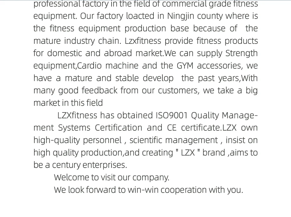 Shandong LZX Fitness Technology Co., Ltd. to continue adhering to the "integrity, innovation, hard work, win-win" business philosophy,and sincerely look forward to cooperation with each friend, a win-win situation, work together to contribute to the development of fitness! maquinas para gimnasio