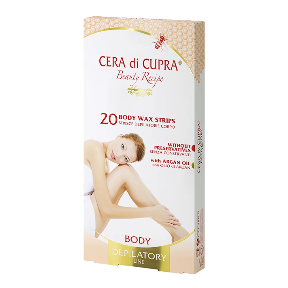 Cera di Cupra body wax strips ensure an effective depilation, leaving the skin extremely smooth and moisturised for long time thanks to the presence of Argan Oil, Beeswax, Calendula and Chamomille. They are easy to use and they remove unwanted hairs quickly. They are suitable also for very sensitive and delicate residues. Dermatologically tested.
