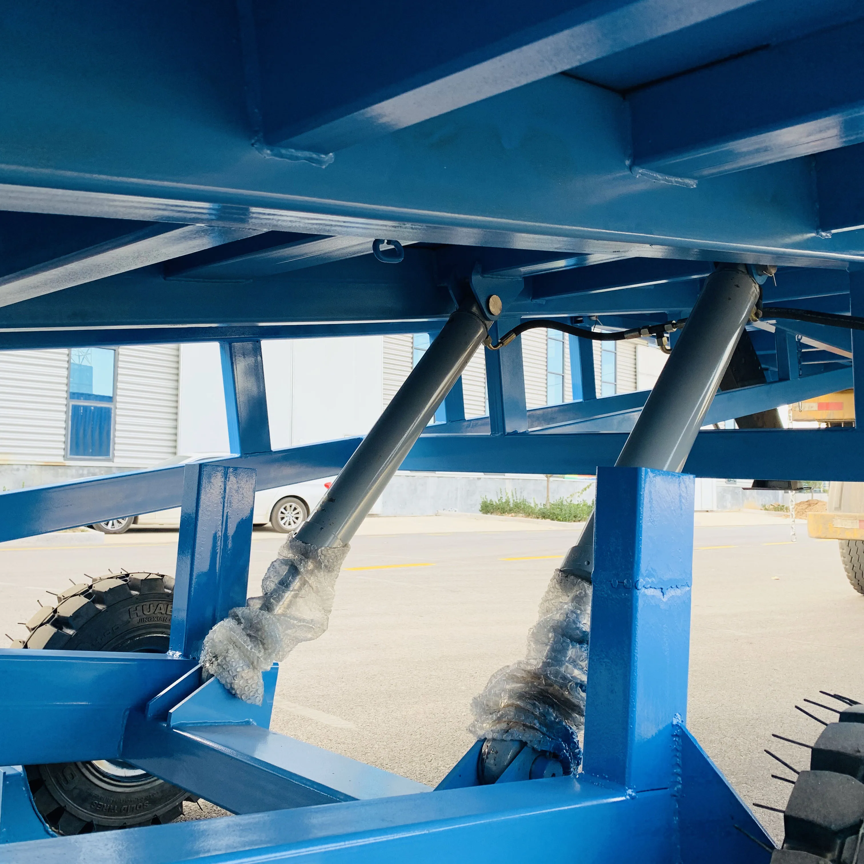 1. Hydraulic power for easy operation. 2. The lip plate and the platform are connected by a long axis, which has high strength and reliability. 3. Imported seals ensure excellent sealing performance of the hydraulic system. 4. The anti-skid pattern steel plate is used to make the platform have good anti-skid performance. 5. High-strength assistant outriggers, strong carrying capacity, stable and durable.