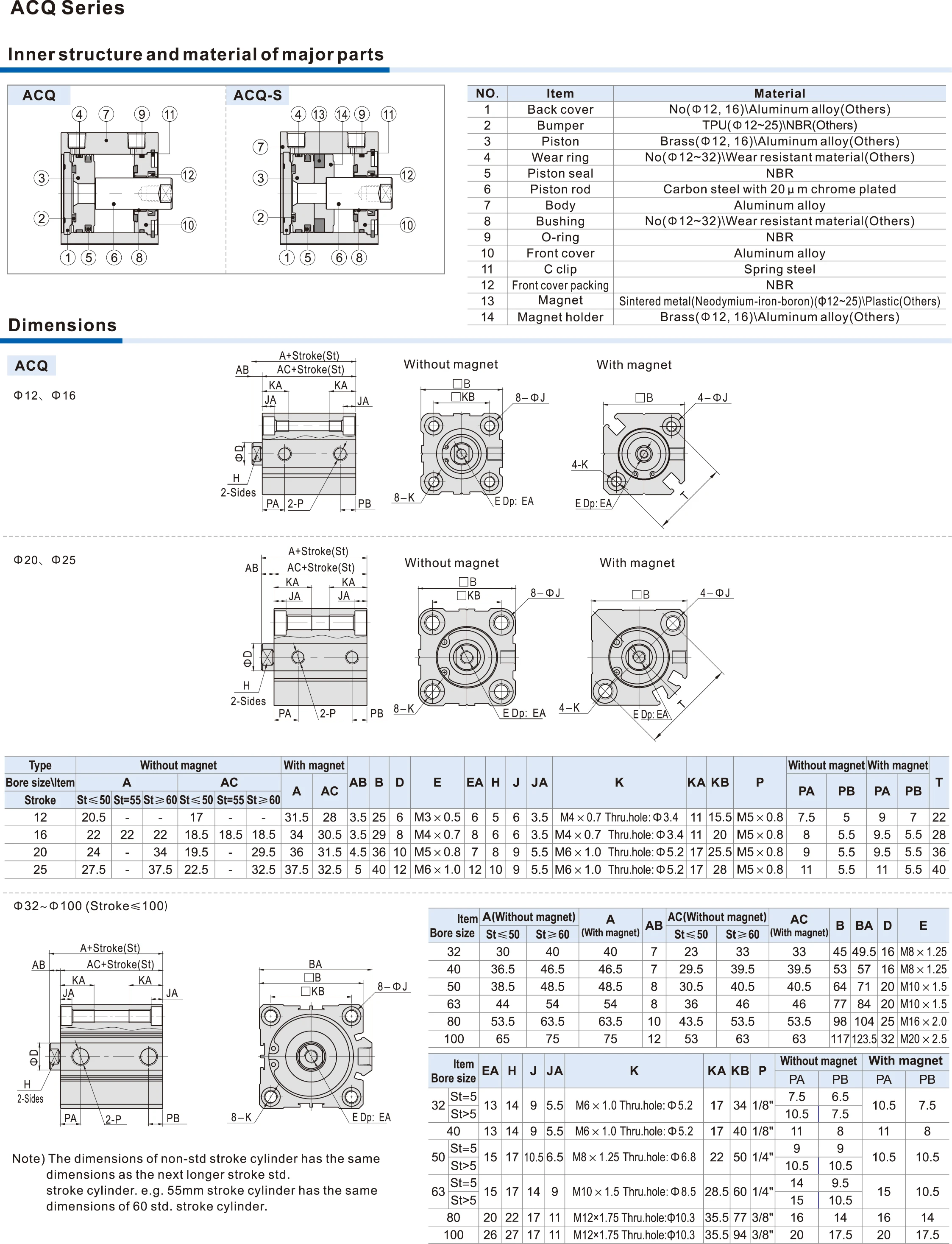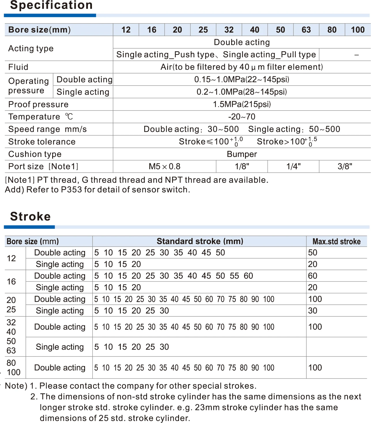 1. JIS standar is implemented. 2. C clip is adopted to connect the cylinder boday and back over or front cover, and riveted structure is compact and reliable. 3. The internal diameter of the body is treated with rolling followed by the treatment of hard anodizing, forming and excellent adrasion resistance and durablity. 4. The seal of pston adopts heterogeneous two-way seal structure. 5. Compact structure can effectively save installation space. There are magnetic swich slots around the cylinder boday which is convenient to install inducting switch. 7. Installing accessories wigh varous specification. | ||