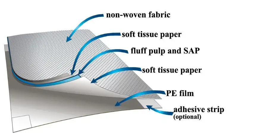 Nonwoven top sheet,tissue paper,sap,pe film back sheet
