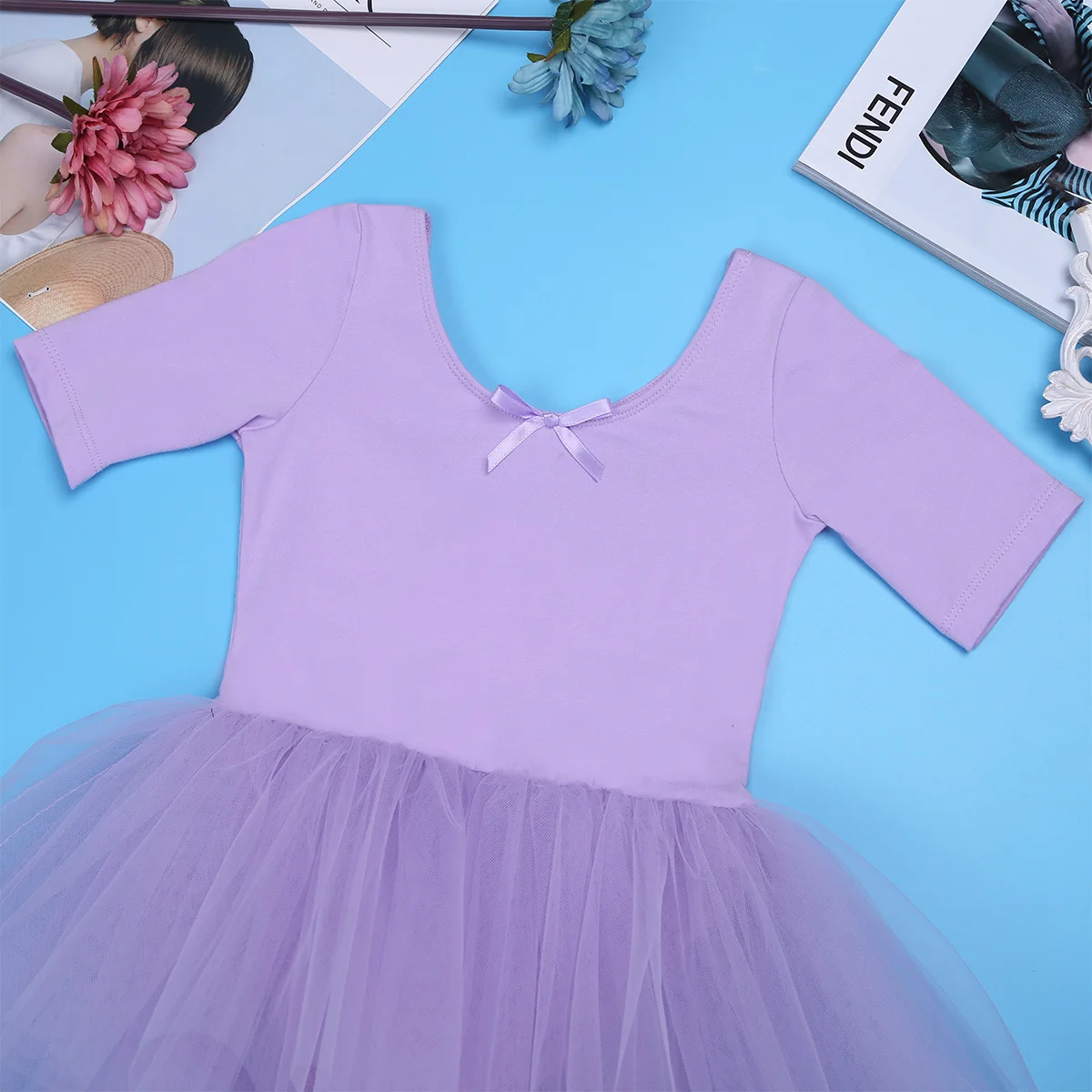 Kids Girl's Ballet Dance Leotard Dress, short sleeves. Size Table means age ranges for girls, but they are for general guidance only. U-neckline with an irremovable bow in the front, straps criss cross at back. 4 layers mesh skirt with built-in knickers underneath. Suitable for dance class, gymnastic exercise, stage performance, etc.