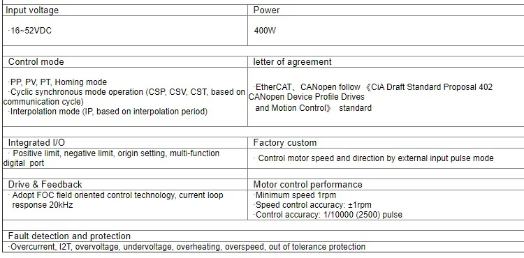 1.Highly integrated design reduces installation complexity and saves space · Eliminate the matching process between the driver and the motor, reducing the cost of use 2.Adopt EtherCAT/CANopen protocol (DS402)Wide voltage input (16~52VDC), can be powered by battery 3.Optional off brake protection 4.Integrated single-turn absolute encoder, limited zero memory 5.Provide speed and position feedforward parameter configuration to improve response speed 6.Integrated I/O, can be set to positive limit, negative limit, origin, multi-function digital output, pulse input detection 7.Real-time fault monitoring and protection functions, including overcurrent, I2T overload, overvoltage, undervoltage, overheating,overspeed, and out of tolerance protection 8.Provide application scenarios and development kit support for multiple scenarios, shortening user development cycle 9.Can be customized in a variety of sports mode features: two-wheel differential drive mode, wheelset slip alarm, etc. | ||||||||